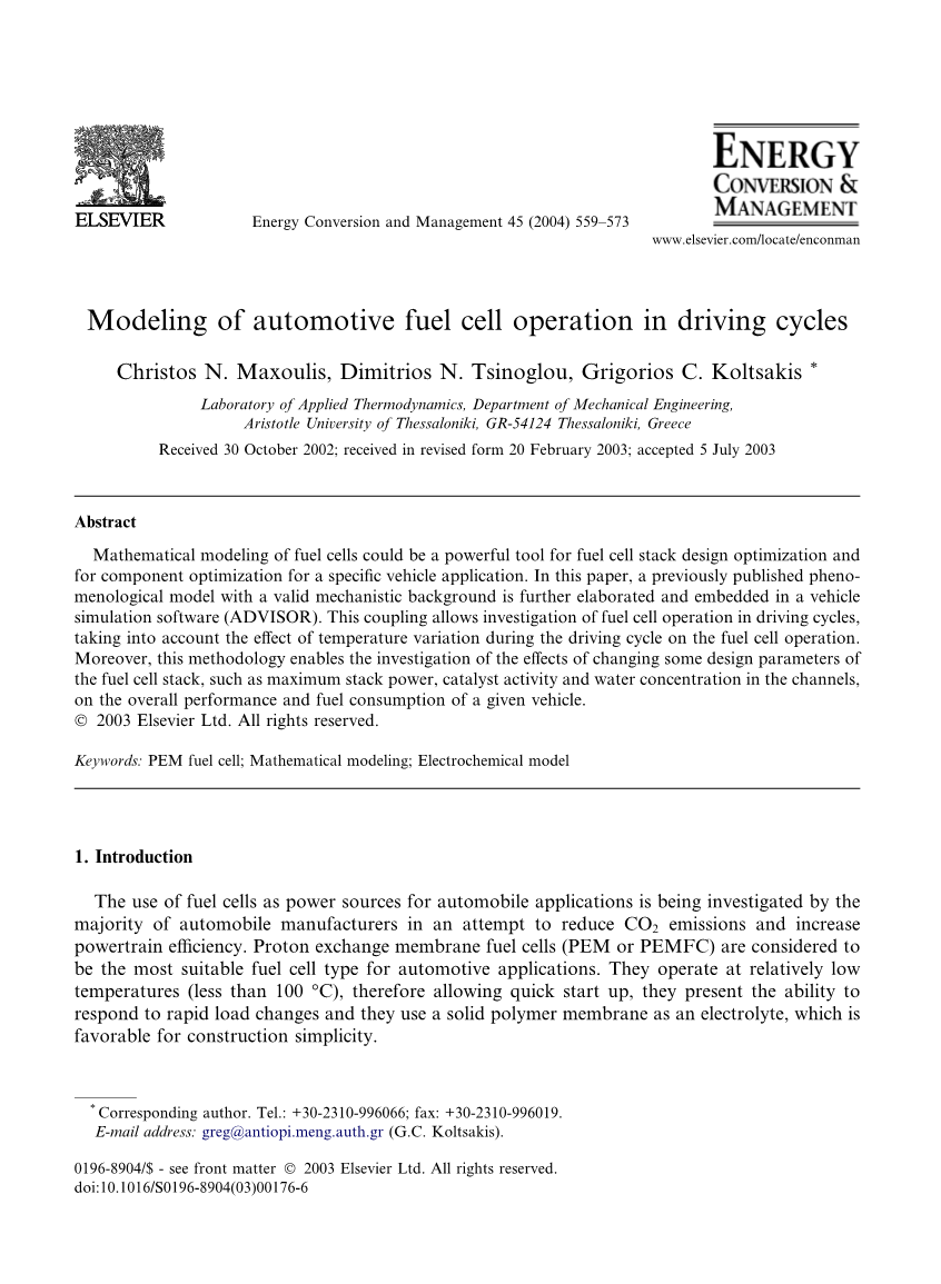 第二种方法包括基于经验或半经验方程的模型,其用于预测不同输入参数对燃料电池的电压 - 电流特性的影响,而不深入检查燃料中涉及的物理和电化学现象细胞操作。 Amphlett et al。 [11,12]提出了这种具有良好机械背景的“现象学”模型,后来进一步发展[13,14],也适应老化效应。其他类似模型包括Lee等人的工作。 [15]和Buyuktur et al。 [16],其中还包括前视传动系统和车辆动力学模型。许多类似的模型对于特定的燃料电池系统返回令人满意的结果,但很少具有更广泛的适用性。该建模方法主要用于在系统级的优化,即选择用于特定车辆应用的最优组件。