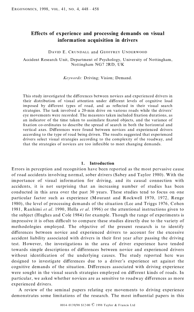 对眼睛运动与驾驶有关的重要论文的回顾证明了研究的一些限制。这篇文章中最有价值的文章是由Mourant和Rockwell(1970,1972)出版的,尽管他们的例子非常少,但他们已经确定了在过去25年里取得了不同程度成功的结果。他们指出,无人驾驶员倾向于搜索视觉场景的一个较小的区域,这个区域被抛在汽车上,并且他们在他们的镜子上做的更少。他们做的事情往往比那些经验丰富的司机的时间更长,他们表现为更多追踪眼球运动。他们还发现,新手的泳道控制标记比经验丰富的驱动程序更频繁。