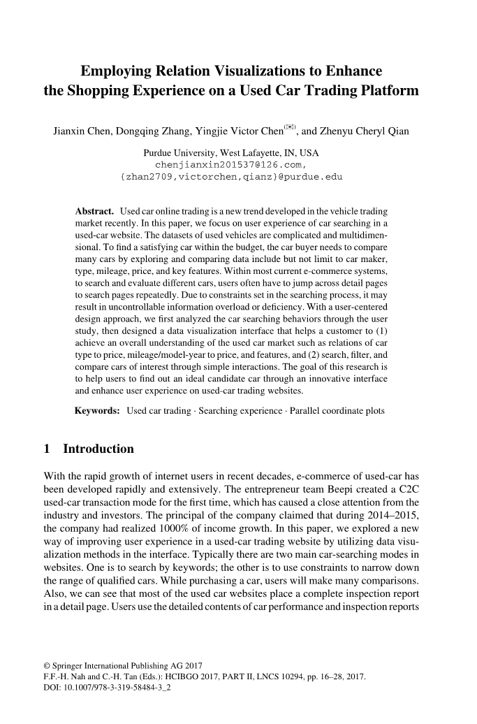 摘要: 利用网络进行汽车贸易是现今车辆交易市场里一种新的发展趋势。在这篇文章中,我们关注使用者在二手车网站搜索体验。二手车辆的数据集是复杂和多维度的。要想在预算内买到满意的汽车,汽车买家进行很多车辆数据的搜索和比较,这些数据包括但不局限于汽车制造商、类型、行驶里数、价格和关键特征。在当前大多数的电子商务系统中,为了搜索和评估不同的汽车,用户经常不得不跨越详细页面来重复搜索页面。由于搜索过程中设置的约束,可能导致无法控制的信息过多或不足。通过以用户为中心的设计方法,我们首先通过用户研究分析汽车搜索行为,然后设计了一个数据可视化界面来帮助客户:(1)全面了解二手车市场,如汽车类型与价格、里程/型号年份与价格的关系和功能和(2)通过简单的交互搜索,过滤和比较感兴趣的汽车。这项研究的目的在于帮助用户通过创新的界面找到理想的候选车,并增强二手车交易网站的用户体验。