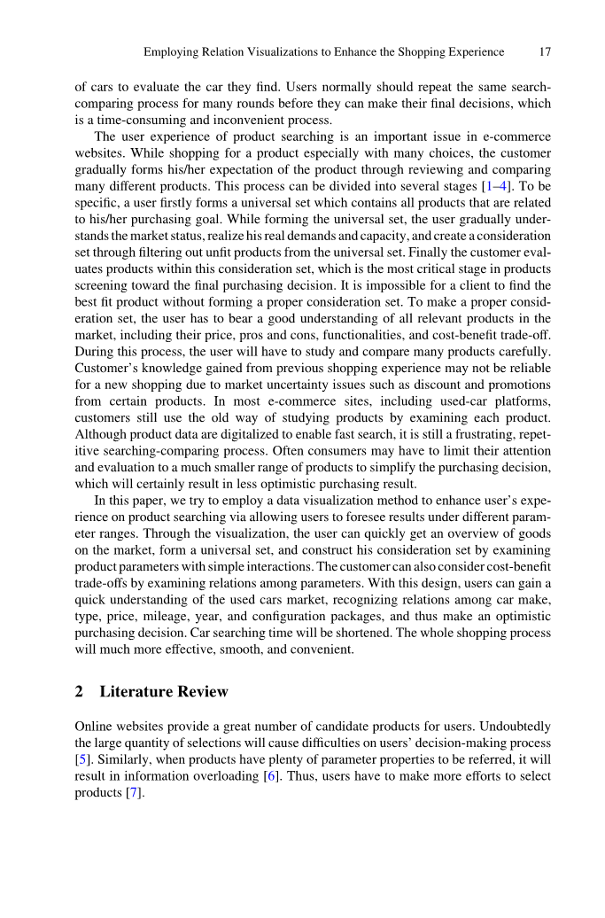 产品搜索的用户体验是电子商务网站中的重要问题。在购买特别是有许多选择的产品时,客户通过审查和比较许多不同的产品逐渐形成他/她对产品的期望。这个过程可以分为几个阶段[1-4]。具体而言,用户首先形成通用集,其包含与他/她的购买目标相关的所有产品。在形成通用集合的同时,用户逐渐了解市场状况,实现其真实需求和容量,并通过从通用集合中过滤掉不合适的产品来创建考虑集。最后,客户评估该考虑集内的产品,这是产品筛选最终购买决策中最关键的阶段。如果没有形成适当的考虑因素,客户就无法找到最合适的产品。为了做出适当的考虑,用户必须充分了解市场上的所有相关产品,包括价格、优缺点、功能和成本效益权衡。在此过程中,用户必须仔细研究和比较许多产品。由于市场不确定性问题(例如某些产品的折扣和促销),客户从以前的购物体验中获得的知识可能不适合新购物。在大多数电子商务网站中,包括二手车平台,客户仍然通过检查每种产品来使用旧的方式来研究产品。尽管产品数据数字化可以实现快速搜索,但它仍然是令人沮丧的重复搜索比较过程。通常,消费者可能不得不将他们的注意力和评估限制在更小范围的产品上以简化购买决策,这肯定会导致不太乐观的购买结果。