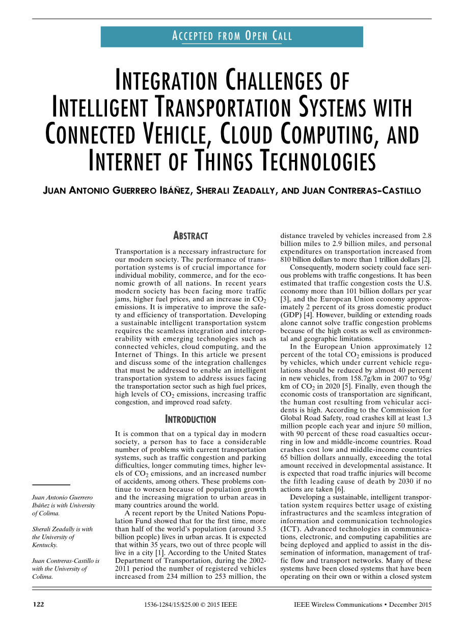 IntegrAtIon chAllenges of IntellIgenttrAnsportAtIon systems wIth connected VehIcle, cloud computIng, And Internet of thIngs technologIes