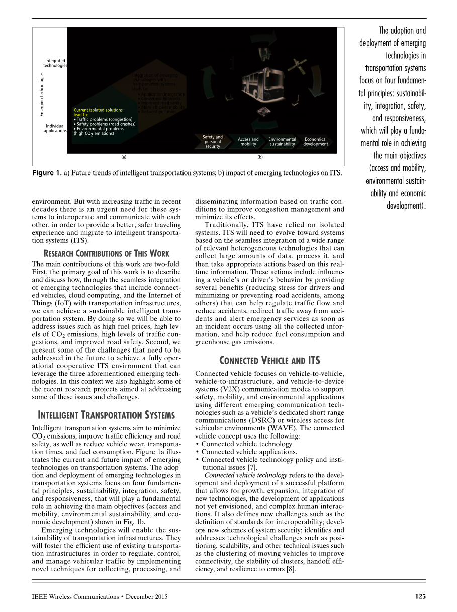 The adoption and deployment of emerging technologies in transportation systems focus on four fundamental principles: sustainability, integration, safety, and responsiveness, which will play a fundamental role in achieving the main objectives (access and mobility, environmental sustainability and economic development). environment. But with increasing traffic in recent decades there is an urgent need for these systems to interoperate and communicate with each other, in order to provide a better, safer traveling experience and migrate to intelligent transportation systems (ITS). reseArch contrIbutIons of thIs Work The main contributions of this work are two-fold. First, the primary goal of this work is to describe and discuss how, through the seamless integration of emerging technologies that include connected vehicles, cloud computing, and the Internet of Things (IoT) with transportation infrastructures, we can achieve a sustainable intelligent transportation system. By doing so we will be able to address issues such as high fuel prices, high levels of CO2 emissions, high levels of traffic congestions, and improved road safety. Second, we present some of the challenges that need to be addressed in the future to achieve a fully operational cooperative ITS environment that can leverage the three aforementioned emerging technologies. In this context we also highlight some