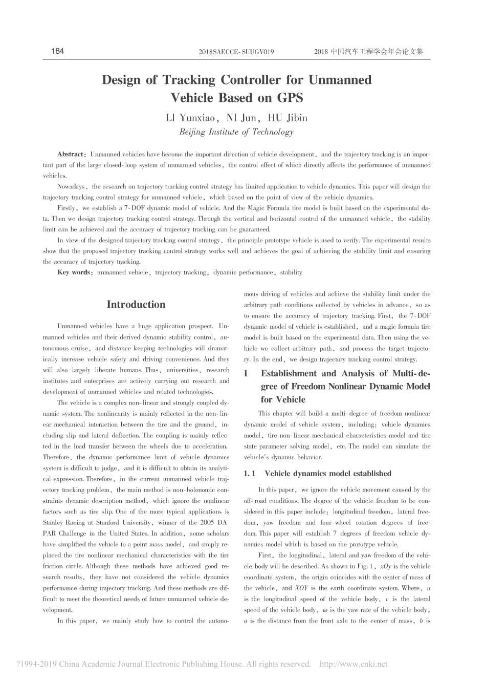 LI Yunxiao[9]设计了无人驾驶车辆的轨迹跟踪控制策略。建立了车辆的动力学模型。并根据试验数据建立了轮胎模型。然后设计了轨迹跟踪控制策略。通过对垂直和水平控制,可以达到稳定极限,保证轨迹跟踪的精度。利用原理样机对所设计的轨迹跟踪控制策略进行了验证。