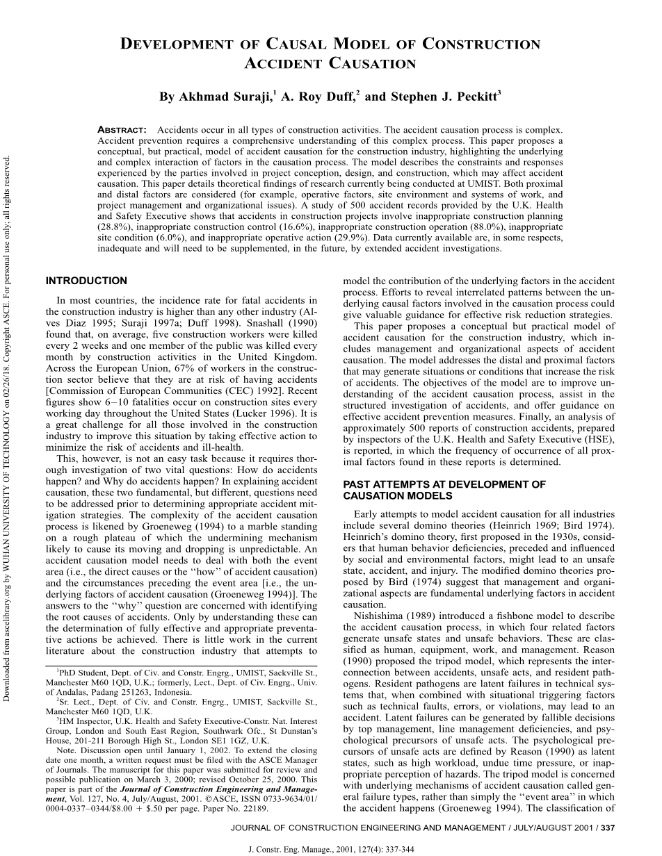 本文提出了一种建筑行业事故因果关系的概念和实用模型,包括事故因果关系的管理和组织两个方面。该模型定义远端和近端因素,这些因素可能会产生加大事故风险的情况。该模型的目的是提高事故因果关系的模糊性。协助对事故进行结构化调查,并提供有效的事故预防措施指导。最后,对大约500起建筑事故报告进行分析,由英国卫生与安全行政机构(HSE)的检查员编写,其中确定了这些报告中发现的所有近端因素的发生频率。