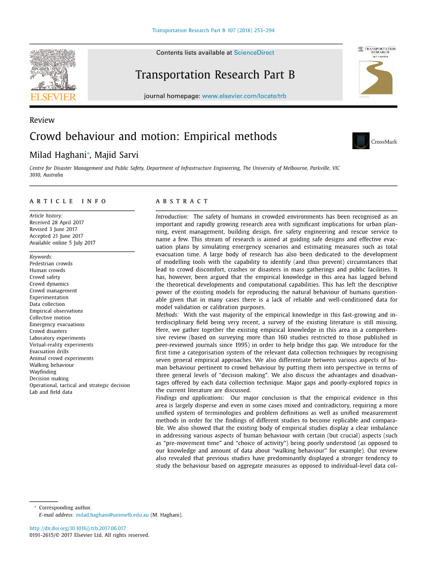 正如前面部分所讨论的那样,我们的重点总体上集中在研究的最终目标是通过确定各种人群现象和管理解决方案来减少“人群灾难”的可能性,或者计划安全快速地“撤离”拥挤的设施。从这个角度来看,我们的一些参考文献可能重点是关于紧急逃生,而另一些则提供了关于人群行为的一般经验证据(可能或可能不适用于紧急情况)。更具体地说,包括关于具有“紧急逃生”的行人(如“建筑物的火灾疏散”(高层或低层))的经验性见解的研究以及具有与“人群管理”和“人群灾难“预防相关的强力经验性构件的研究。