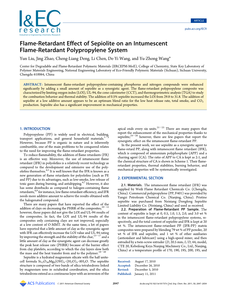 通过添加少量海泡石作为增效剂,能使含磷、氮化合物的膨胀型阻燃聚丙烯材料性能显著增强。通过极限氧指数(LOI)、垂直燃烧、锥形量热仪(CCT)、热重分析(TGA)研究阻燃聚丙烯复合材料的燃烧行为和热稳定性。此外,加入0.5%的海泡石使阻燃聚丙烯复合材料的氧指数从29.8%提高到31.8%。另外,投入少量的海泡石似乎是低放热率、总烟雾和CO2产生量的最佳混合比例。海泡石的力学性能也有很大的提高。