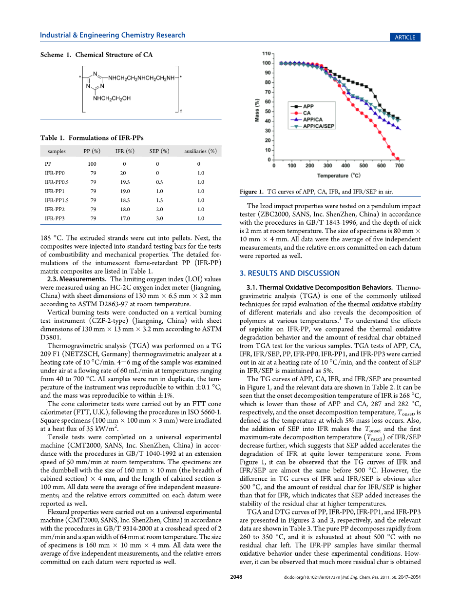 膨胀型阻燃剂(IFR)由威力阻燃化学品公司(中国成都)提供。商业聚丙烯(PP,F401)由扬子石油化工公司(中国南京)提供。原始海泡石购自内乡东风海泡石有限责任公司(中国内乡),原样使用。