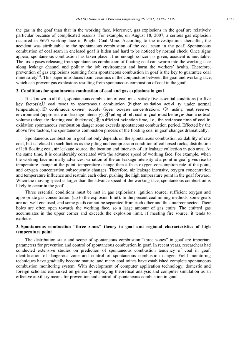 矿井的采空区,尤其是上角的采空区,往往会积聚甲烷和漏气,这是潜在的瓦斯爆炸源。气体控制是一项系统工程,包括预制、监测、注水等。采空区瓦斯是工作面的主要来源之一,其排放占50% -60%。其排放过程受采矿条件、通风参数、边界条件等因素的影响。要描述采空区内的气体比工作面上的气体要困难得多。此外,由于复杂的原因,采空区的瓦斯爆炸比较特殊。例如,2007年8月18日,平湖煤矿695号工作面发生严重瓦斯爆炸。根据之后的调查,事故是由于采空区煤层自燃引起的。封闭采空区煤层自燃是缓慢的,常规检查难以引起注意。一旦有迹象出现,自燃的燃烧就发生了。如果没有足够的关注,事故是不可避免的。浮煤自燃过程中释放的有毒气体可以沿泄漏通道进入工作面,污染工作环境,危害工人健康。因此,防止采空区自燃引起的瓦斯爆炸是保证煤矿安全的关键[1]。本文介绍了在采空区与工作面接缝处的泡沫陶瓷,可以防止采空区煤的自燃引起瓦斯爆炸。