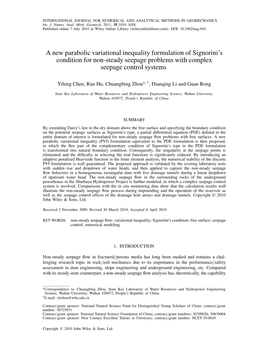 [摘要]通过将达西定律延伸到自由表面上方的干域并指定边界条件在Signorini类型的潜在渗流表面上,定义偏微分方程(PDE)在整个新兴的领域被制定来用于解决具有自由表面的非稳定渗流问题。然后提出等效于PDE公式的抛物变分不等式(PVI)公式,在PDE公式中Signorini类型的补充条件的通量部分被转化为自然边界条件。因此,渗透点的奇点被消除了,选择试用功能的难度大大降低。通过引入Heaviside函数在有限元分析中的应用,离散值的数值稳定性(PVI)得到很好的保证。建议通过现有的实验室测试进行验证水头的突然上升和下降,然后用于捕捉非稳定渗流在线性下拉过程中,在5条排水隧道的均质矩形坝中的上游水头的流动行为。对地下围岩中的不稳定渗流水水电站工程进一步建模,其中涉及一个复杂的渗流控制系统。与现场监测数据的比较表明,计算结果良好说明蓄水期间的非稳定渗流过程和水库的运行情况以及排水孔阵和排水隧道的防渗效果。版权 2010John Wiley&Sons,Ltd.