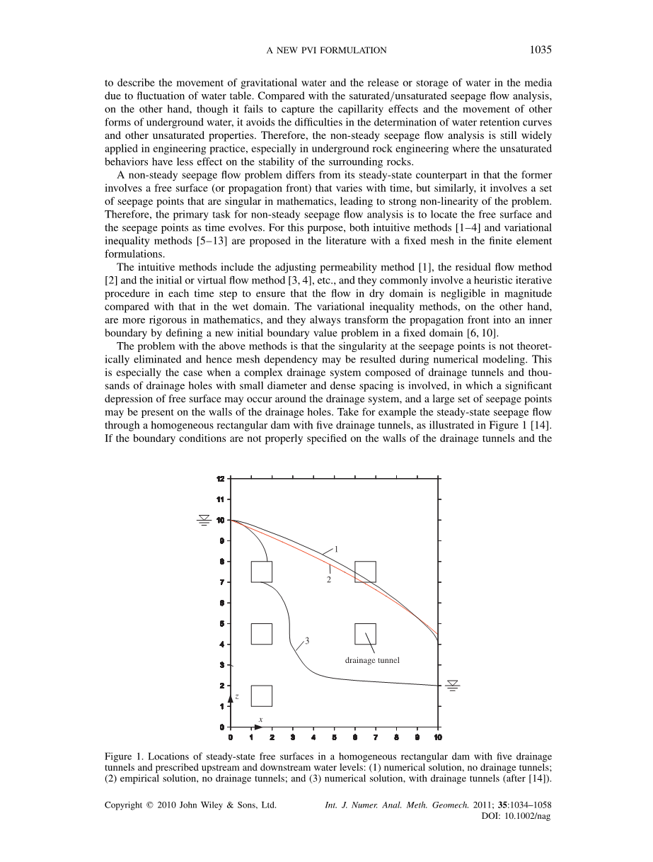 不稳定的渗流问题与稳态渗流问题的不同之处在于前者涉及随时间变化的自由表面(或传播前沿),但类似地,它涉及一组的数学中单数的渗透点,导致问题的强非线性。因此,非稳定渗流分析的首要任务是定位自由表面和随着时间的推移渗透点。 为此,在直观的方法[1-4]和文献中提出了不等式方法[5-13],有限元中使用了固定网格配方。