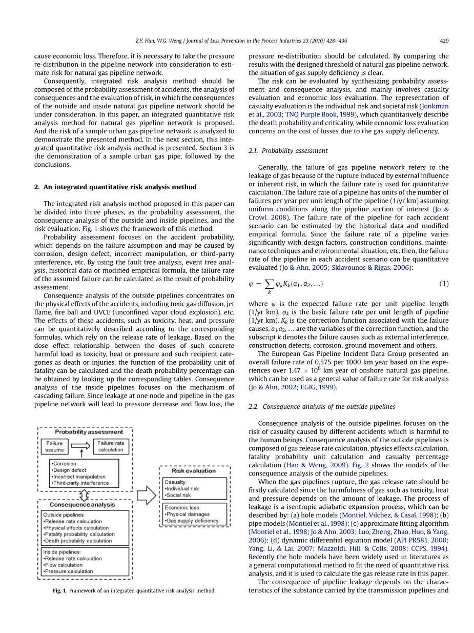 一些QRA方法已被用于识别和评估天然气管道的风险(Arnaldos,Casal,Montiel,Sanchez-Carricondo和Vilchez,1998; Cagno,Caron,Mancini和Ruggeri,2000; Metropolo&Brown,2004; Jo& Ahn,2005; Sklavounos&Rigas,2006; Jo&Crowl,2008; Krueger&Smith,2003; Suardin,McPhate,&Sipkema 2009)。但是,这些广泛使用的风险分析和评估方法具有一定的限制。这些现有方法尚未全面分析各种事故后果,如毒性,燃烧和爆炸等,这些后果具有不同的物理模型,可能对人类造成不同的危害,进而影响个体风险和社会风险的空间分布。而且,现有的方法没有考虑到内部天然气管道的后果。事实上,一个节点或管道处的泄漏可能导致管道网络中的压力重新分配。如果管网中某些路段的压力低于相应的阈值,则气源供应不足可能会中断工业生产并导致经济损失。因此,评估天然气管网的风险,需要考虑管道网络的压力再分配问题。
