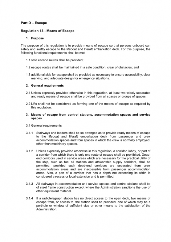 本规例的目的,是提供逃生的方法,让船上人士可以逃生,安全迅速地逃到救生艇和救生筏登船甲板上。为此目的,应满足以下功能要求: