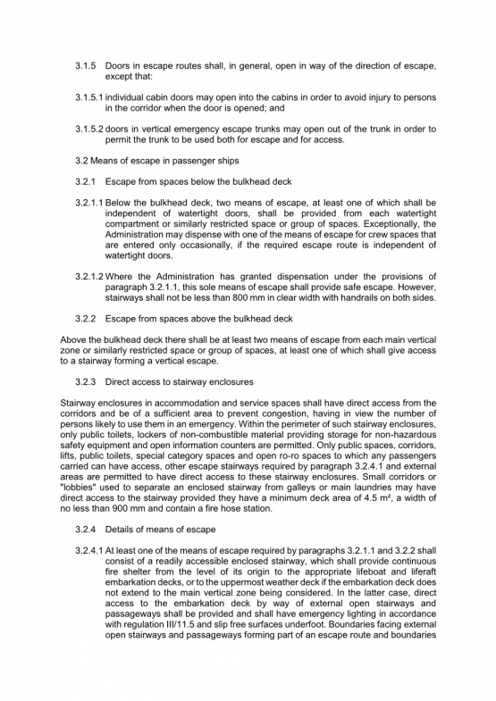 3.2.4.1第3.2.1.1条和第3.2.2条规定的逃生方法中,至少有一种方法由一个容易接近的封闭楼梯组成,该楼梯应该是连续的水平消防掩体,从它的起源到合适的救生艇和救生筏或登船甲板(如果登船甲板有的话,可以延伸到最上面的露天甲板,不考虑延伸的主要垂直区域)。在后一种情况下,直接由外部开放的楼梯应设置通道,并按规定配备应急照明。如果对外部边界开放的楼梯和过道构成逃生路线和边界的一部分,在这种情况会阻碍他们在火灾中逃生,同时要注意登船甲板应具有防火完整性,包括绝缘值,根据表9.1至9.4,视情况而定。