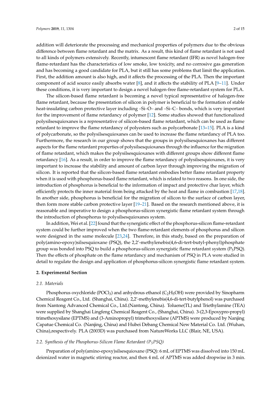 与磷基阻燃剂一起使用时,有两个原因。在一个方面,引入磷的是冲击和保护炭层的信息,这有效地保护从燃烧通过热和火焰被攻击的内部材料有利[17 ,18 ]。在另一侧,磷是有益的硅与碳层的表面迁移,然后形成更稳定的碳保护层[ 19 ,21 ]。在上述研究的基础上,通过将磷引入聚倍半硅氧烷体系中来设计磷硅协同阻燃体系是合理和必要的。