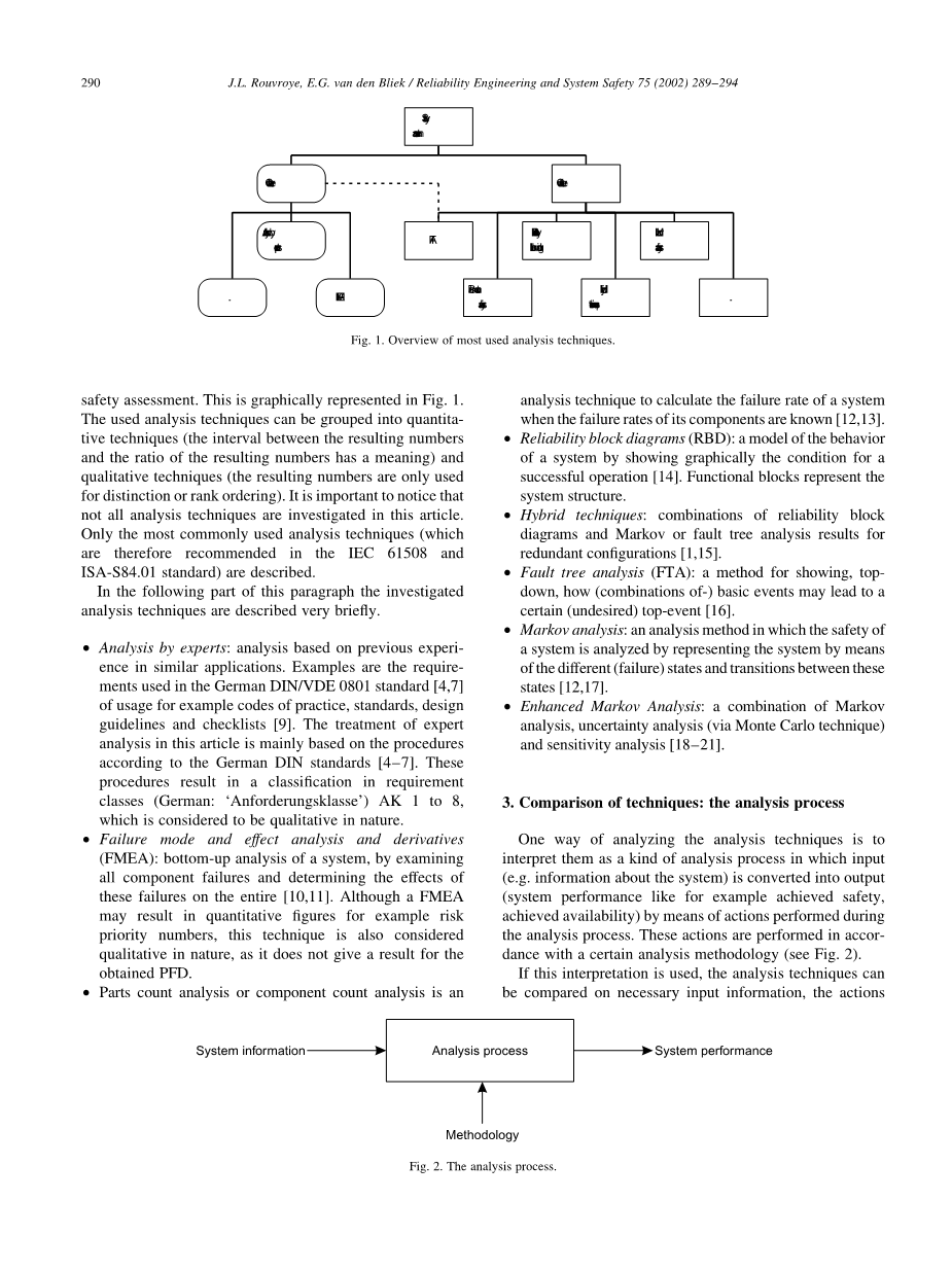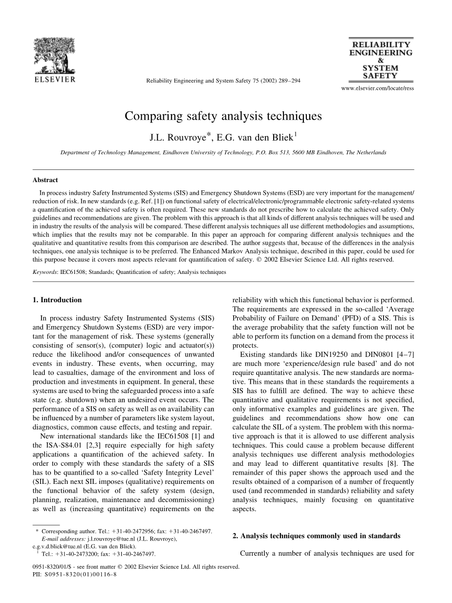 像DIN19250和DIN0801[4plusmn;7]这样的现有标准更是基于经验或者设计规则,不需要定量分析。新标准是规范性的,这意味着在这些标准中,定义了SIS必须满足的要求。实现这些定量和定性要求的方法没有具体说明,只给出了信息示例和指南。指南和建议说明了如何计算系统的SIL,这种规范方法允许使用不同的分析技术。这可能会产生问题,因为不同的分析技术使用不同的分析方法,并可能导致不同的定量结果[8]。本文的其余部分展示了所使用的方法和对一些常用(和标准中推荐的)可靠性和安全性分析技术进行比较的结果,主要集中在定量方面。