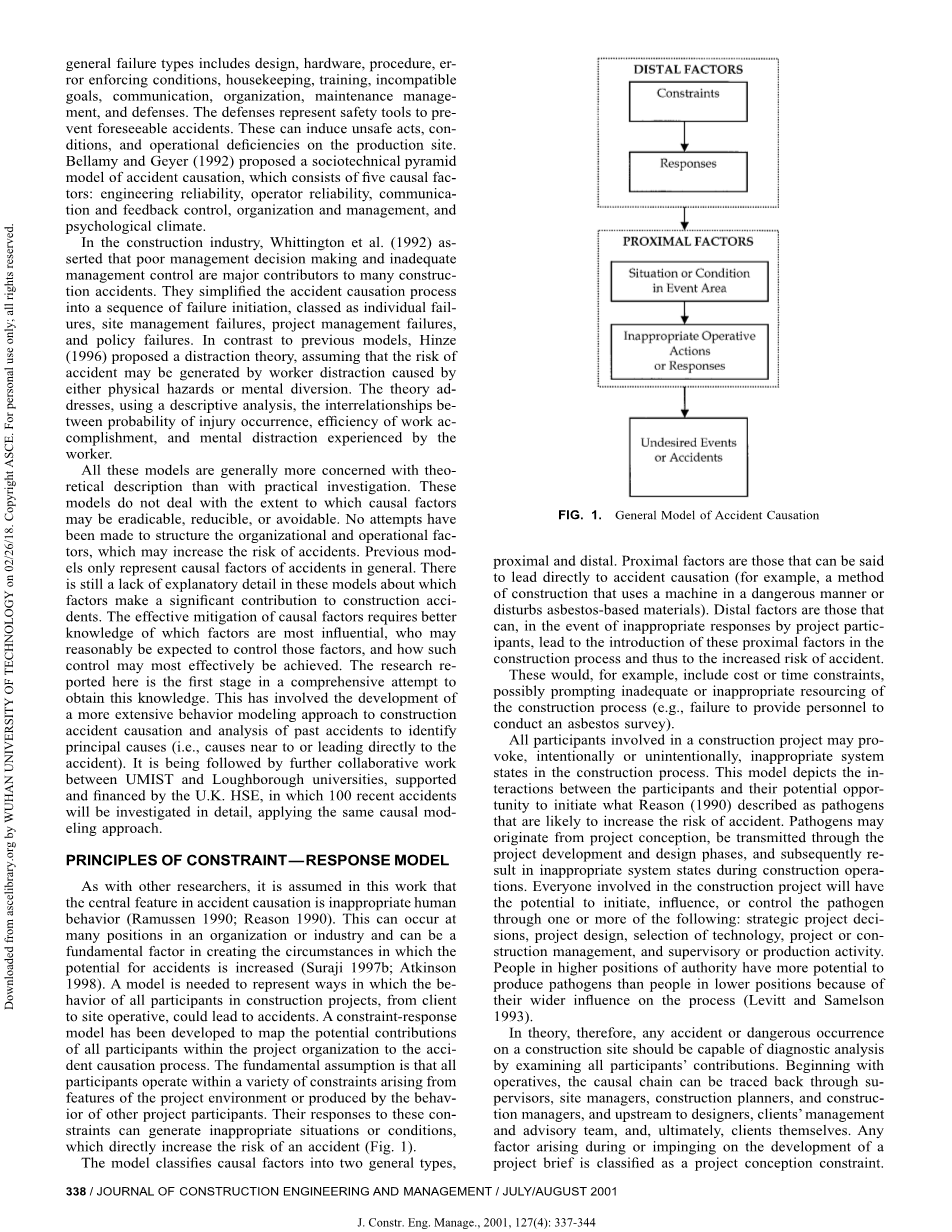 然而, 这并不是一件容易的事情, 因为这需要彻底调查两个关键问题:事故是如何发生的?为什么会发生事故呢?在解释事故因果关系, 这两个基本但不同的问题需要在确定适当的事故缓解策略之前得到解决。Groeneweg (1994年) 将事故因果关系过程的复杂性比作一个大理石, 它站在一个粗糙的高原上, 破坏机制可能导致其移动和下降是不可预测的。事故因果关系模型需要处理事件区域 (即事故因果关系的直接原因或 '如何导致意外的原因') 和事件区域之前的情况 [即事故因果关系的不正当因素 (Groeneweg, 1994年)]。'为什么' 问题的答案与查明事故的根源有关。只有了解这些, 才能确定充分有效和适当的预防行动。目前关于建筑业的文献中几乎没有任何工作对模拟事故过程中潜在因素做出贡献。努力揭示因果关系过程中涉及的非相关因果因素之间相互关联的模式, 可以为有效的减少风险战略提供宝贵的指导。本文从事故原因的管理和组织两个方面, 提出了建筑行业事故因果关系的概念性但实用的模型。该模型解决了可能产生增加事故风险的情况或条件的远端和近端因素。该模型的目的是改进事故原因分析过程的不健全性, 协助对事故进行结构化调查, 并为有效的事故预防措施提供指导。最后, 对英国检查员编写的约500份建筑事故报告进行了分析。报告的健康和安全执行人员在其中确定了这些报告中发现的所有代理因素的发生频率。