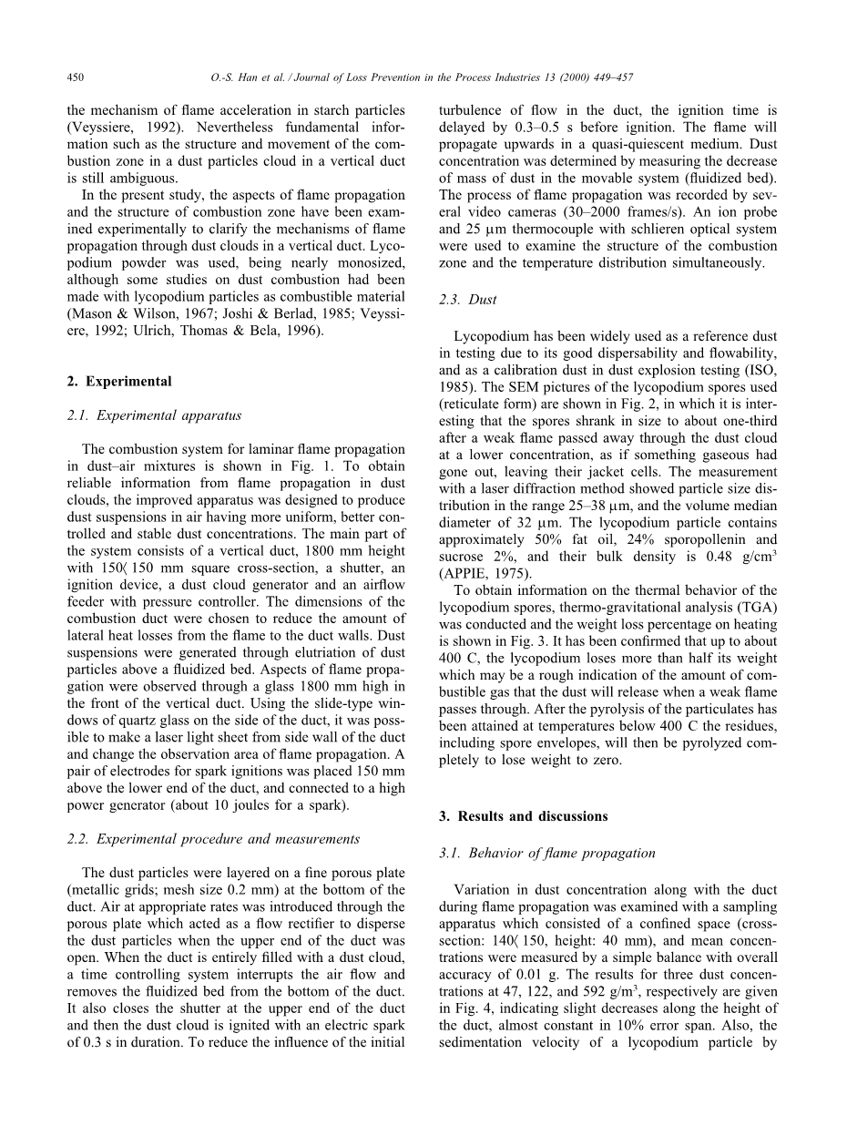 石松属植物由于其良好的分散性和流动性已被广泛应用作为测试参考粉尘,并在粉尘爆炸测试中作为校准尘埃(ISO 1985)。扫描电镜照片的石松孢子用(网状型)如图2所示,有趣的是,在管道中一阵微弱的火焰以低浓度一闪而过后,石松孢子缩小了大概三分之一。好像某种气态物质离开他们的套细胞出去了。用激光衍射法测量,结果显示粒子尺寸分布分布范围在25–38micro;m,体积平均直径32micro;m。石松粒子中大约含有50%的脂肪油,24%孢粉素和2%蔗糖,其密度为0.48克/立方(粉体工业技术协会,1975)。为获得石松孢子的热行为的信息,进行了热重分析法(TGA),加热失重率如图3所示。已经证实,高达约400°C时,石松会失去超过一半的重量,这可能只是可燃气体的粗略显示量,当微弱的火焰通过时,粉尘就会释放。当颗粒的热解已经达到400度以下的余温,包括孢子外壳,将热解到零。