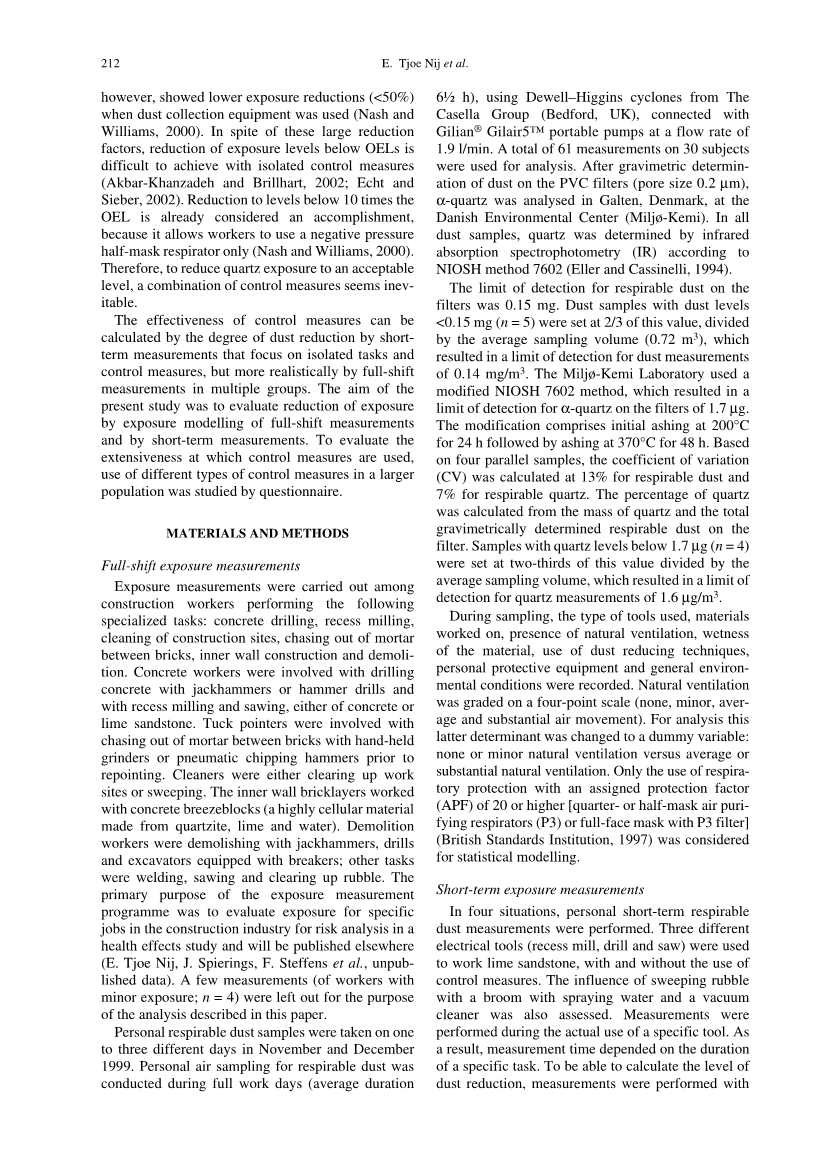 在执行以下专门任务的施工人员中进行了暴露测量:混凝土钻孔,凹槽铣削,施工现场清洁,砖块之间的追逐,内壁施工和拆除。混凝土工人参与了钻机混凝土的钻孔锤或锤钻,并且采用凹槽铣削和锯切,无论是混凝土还是石灰砂岩。在重新点燃之前,Tuck指针涉及到用手持式研磨机或气动切碎锤之间的砂浆中追逐砂浆。清洁工是清理工作场所或扫地。内墙砌砖工工作上用混凝土微风块(由石英岩,石灰和水制成的高度多孔材料)。拆装人员用装有破碎锤的钻机,钻机和挖掘机拆除; 其他任务是焊接,锯切和清除瓦砾。暴露测量计划的主要目的是评估建筑行业在健康影响研究中的风险分析中的特定工作的风险,并将在其他地方出版(E. Tjoe Nij,J. Spierings,F. Steffens等,未发布的数据)。为了本文所述的分析目的,少量测量(少量暴露的工人,n=4)被排除在外。在1999年11月及12月一至三个不同日子里,采用个别可吸入粉尘样本。利用卡塞拉集团的连接有流量为1.9升/分钟的Gilianreg;Gilair5trade;便携式泵的Dewell-Higgins旋风器(贝德福德,英国),来进行在完整工作日(平均持续时间为6frac12;小时)内可吸入粉尘的个人空气取样。对30名受试者进行了总共61次测量来用于分析。在PVC过滤器的粉尘重量确定后(孔径0.2mu;m),alpha;石英在位于丹麦加尔滕的丹麦环境中心进行了分析(Miljoslash;-Kemi)。在所有灰尘样品中,石英通过根据NIOSH方法7602的红外吸收分光光度法(IR)来测定(Eller和Cassinelli,1994)。