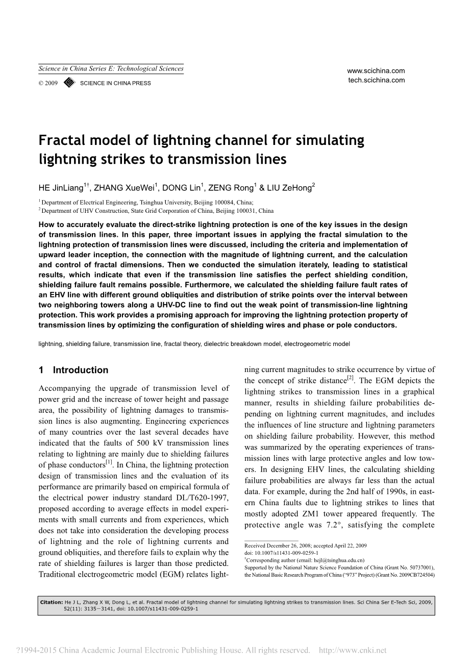随着电网传输水平的提高和塔高和通道面积的增加,输电线路雷电损坏的可能性也在增加。过去几十年来,许多国家的工程经验表明,与雷电相关的500kV输电线路的故障主要是由于相导体的屏蔽故障[1]。在中国,输电线路的防雷设计及其性能评估主要依据电力工业标准DL / T620-1997的经验公式,根据小电流和经验模型实验的平均效应提出,而没有考虑到闪电的发展过程和雷电流和地面倾斜的作用,因此不能解释为什么屏蔽故障率大于预测的频率。传统的电子地理模型(EGM)通过雷击距离的概念将雷电电流的大小与雷击发生联系起来[2]。 EGM以图形方式描绘了雷电对传输线路的雷击从而导致屏蔽失效的概率取决于雷电流大小,并包括线路结构和雷电参数对屏蔽故障概率的影响。然而,这种方法是通过具有大保护角和低塔的跨任务线的操作经验来总结的。在设计EHV线时,计算屏蔽故障概率总是远低于实际数据。例如,20世纪90年代后期,中国东部地区由于雷击对大多采用ZM1塔线的故障频繁出现。保护角为7.2°,满足EGM的完全屏蔽条件。据现场调查,得出结论即使在这种情况下,由于雷击的分散,屏蔽故障也是可能的。传统方法受到挑战,闪电先导的发展显示出具有分支和曲折结构的随机放电通道。由于具有自相似的特征,可以用分形数据很好地描述。为了研究平面气体放电,Niemeyeretal提出了一种称为DBM(电介质击穿模型)的计算机模拟的格子分形模型。此后,许多研究人员将其应用于闪电通道的动态仿真。用分形方法研究的闪电通道结果显示出其具有分支和曲折特征。分形仿真的过程也与闪电先导放电过程相似。然而,分形更多地用作描述性工具,没有丰富的工程应用。虽然用于参考,但使用分形法预测了对实际结构雷击的概率,模拟结构过度简化,工作没有得到可以直接应用于工程的结果。本文的主要目的是将闪电分形模型应用于传输线的防雷。我们希望我们的工作将为EHV和特高压输电线路的防雷设计带来一些新的亮点。