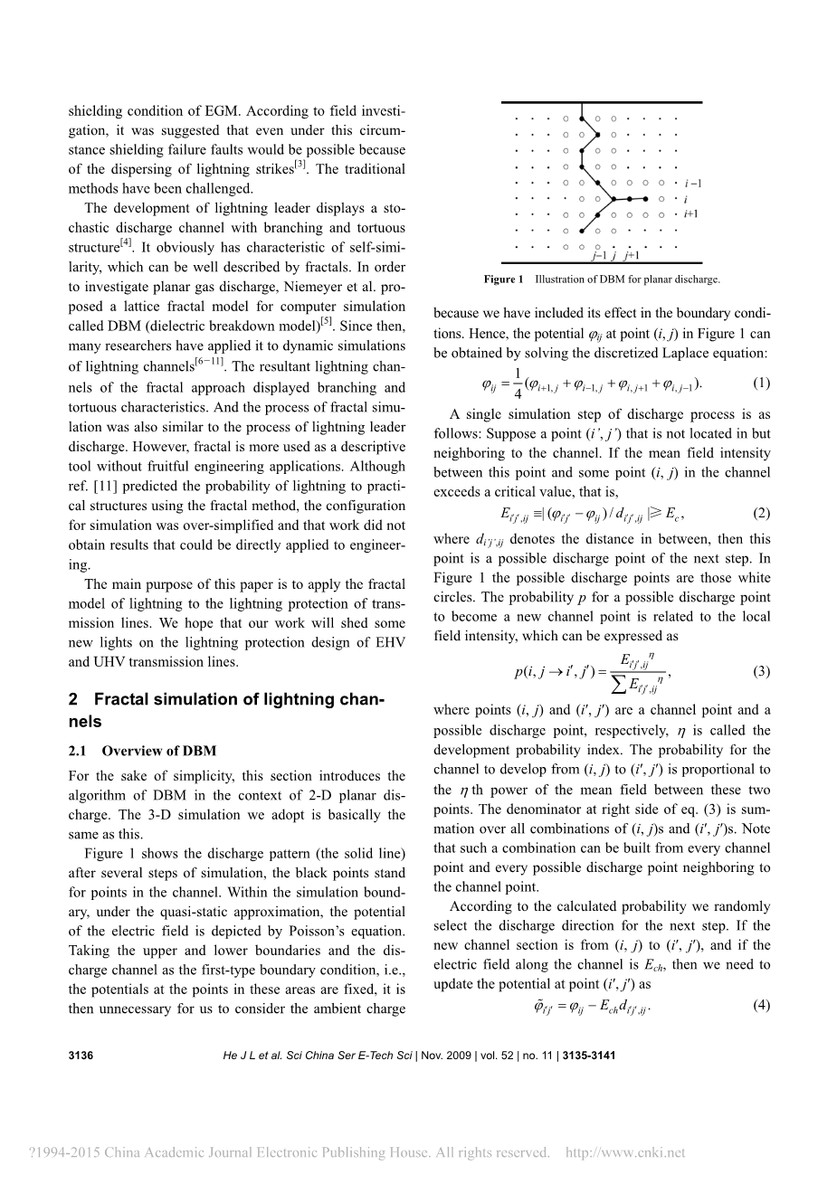 其中表示两者之间的距离,则该点是下一步骤的可能放电点。在图1中,可能的放电点是那些白色的圆圈。可能的放电点成为新的通道点的概率p与局部场强有关,可以表示为