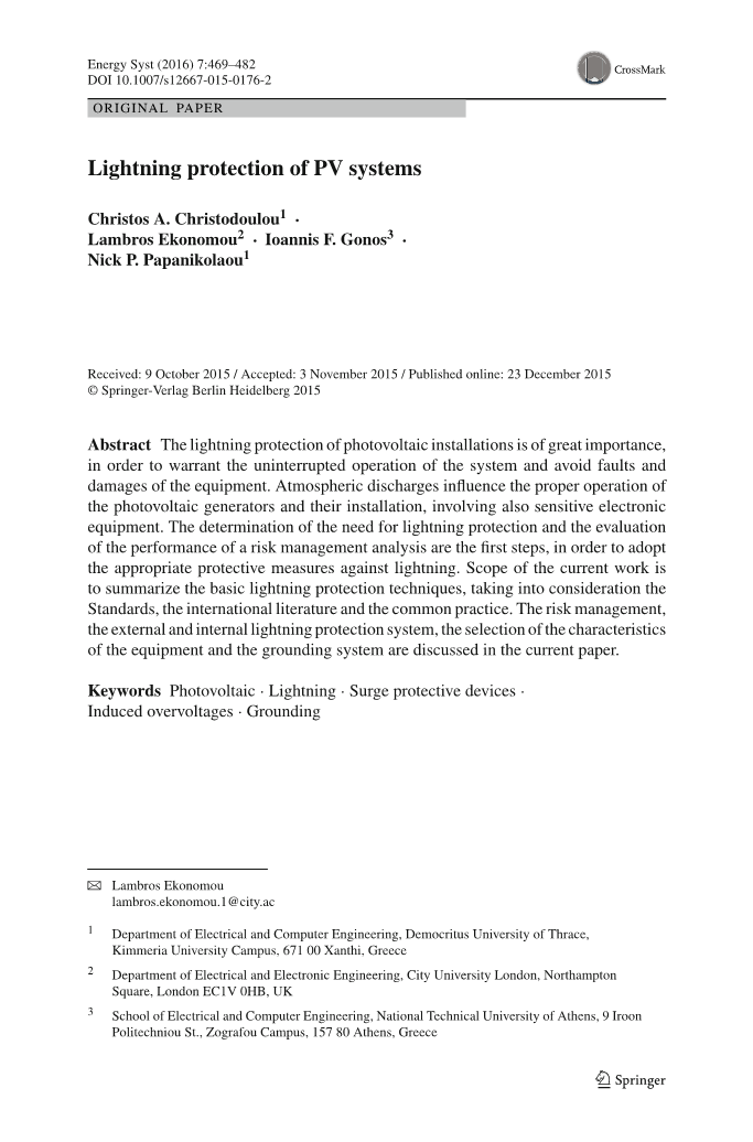理论上(通过使用适当的仿真工具)[1,2,5,7-10]或实验(通过执行实验室或现场测量和测试)研究了各种研究[11-17]光伏系统的闪电性能。在[7]中,讨论了动态防雷,其重点是提高整个系统的闪电性能的预防措施。在[1]中,考虑到雷击点的影响,雷电电流振幅,建筑高度,土壤电阻率和太阳能阵列之间的距离,对屋顶光伏系统中的雷电过电压进行灵敏度分析和外部保护系统。在[2]中,已经开发了一个适当的计算机程序来决定是否需要在光伏系统中安装防雷保护;计算机程序可以通过使用保护角度方法给出如何安装避雷针的设计。在[8]中,将两个不同的外部LPS安装到两个不同的光伏技术电厂系统中进行了比较。在总能量产生和能量产出方面对各自的系统性能进行了比较。作者强调,发电厂通过安装LPS来最大限度地减少光伏系统雷击的重要性,并突出了降落在光伏组件上的雷电阴影的作用,从而提高太阳能电池的温度并减少发电量。 [9]的研究人员估计雷电放电引起的过电压,并根据风险分析和保护成本的结果评估雷电防护措施的实际需要。在[5]中,闪电对光伏系统的影响与该地区的等离子体水平和建筑物的高程直接相关,同时为高层次太阳能区域的光伏面板屋顶的空气终端系统的适当设计提供了建议。在[10]中,作者实施了广义修改网格电流法,以建立具有和不具有外部LPS的光伏电力系统的雷击瞬态仿真的细线系统的时域多端口模型。在[11]中,研究人员介绍了通过浪涌发生器注入的雷电瞬态电流对实际MW级光伏电站的直流过电压保护系统的影响的测量过程中的经验。在[17]中,考虑到光伏阵列中的雷电感应电压瞬变,监测两个光伏阵列端子处的电压。在[12]规模的实验室测试和几何精确的模拟模型中,试图评估长直流电缆环路上的感应过电压。在[13]中,研究了雷电冲击电压对光伏组件功率输出的影响。在[14]中,对一种多晶硅光伏组件进行了标准雷电冲击电压的实验,并对其暗I-V特性曲线和I-V特性进行了比较。在[15]中,制造了具有光伏板的混凝土基础的发光浪涌分析模型,并经过实验验证。基础模型用于对全系统光伏系统中的直流配电系统进行建模,并使用有限差分时域(FDTD)方法评估浪涌保护装置(SPD)所需的电流耐受能力。 [16]讨论了雷击期间造成的光伏面板损坏。