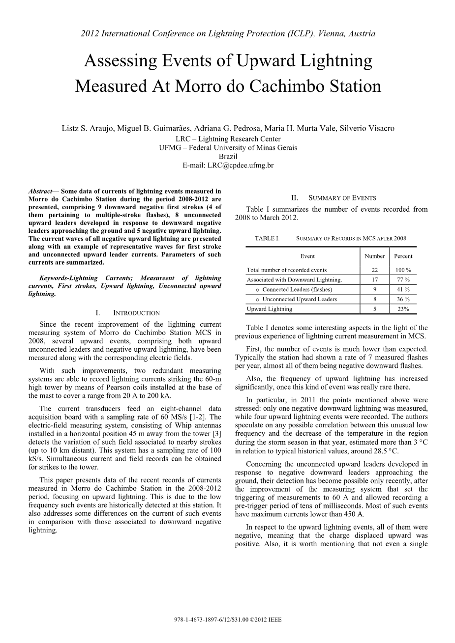 本文介绍了2008-2012年期间在Morro多卡西姆波站测得的最新海流记录数据,重点是上行闪电。这是因为历史上在该站检测到这种事件的频率较低。它还解决了与向下负闪电相关的事件相比,此类事件电流的一些差异。