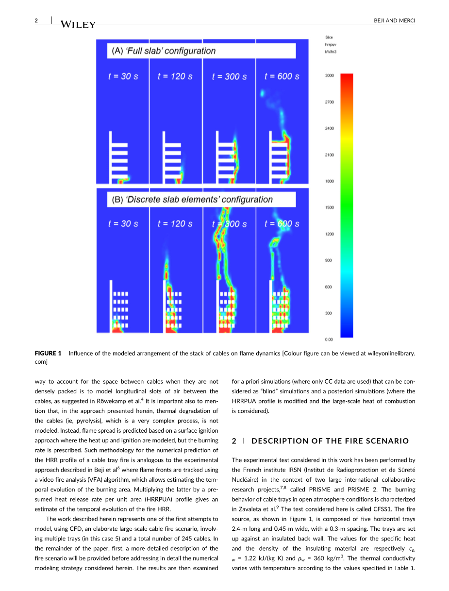 本文描述的工作是首次尝试利用CFD模拟复杂的大规模电缆火灾场景,涉及多个托盘(在本例中为5个)和245根电缆。在本文的其余部分中,首先,在详细描述本文所考虑的数值建模策略之前,将对火灾场景进行更详细的描述;然后对结果进行先验模拟(只使用CC数据)和后验模拟(修改HRRPUA剖面并考虑大规模燃烧热)。