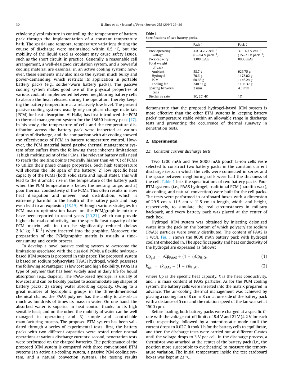 在恒流放电实验中,选择2个1300mAh和5个8000mAh的袋装锂离子电池组成两个电池组,电池组串联,相邻电池间的间距为电池厚度的一半。表1列出了两个电池组的规格。为电池组构建了四个BTM系统(即PAAS水凝胶、传统的PCM(石蜡)、空气冷却和自然对流)。在长、宽、高分别为29.5厘米times;11.5厘米times;11.5厘米的纸板箱中进行试验,模拟军用背包的实际情况,每个电池组都放在箱子的中心。