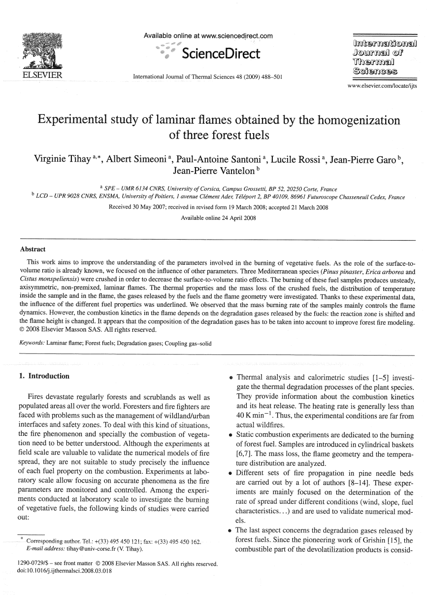 摘要:这项工作的目的是增进对植物燃料燃烧所涉及的参数的了解。由于表面积和体积比的作用是已知的,我们重点研究了其他参数的影响。我们对海岸松、欧石南和聚伞岩蔷嶶三种树种进行了粉碎,以降低其表面积和体积比的影响。燃烧这些燃料样品会产生不稳定、轴对称、非预混的层流火焰。我们调查了破碎燃料的热性能和质量损失、试样内部和火焰内的温度分布、燃料释放的气体和火焰几何形状。利用这些实验数据,明确了不同燃料性能的影响。我们观察到,样品的质量燃烧速率主要控制火焰动力学。然而,火焰的燃烧动力学依赖于燃料所释放的降解气体:反应区发生位移,火焰高度发生变化。看来,要改进森林火灾模型,必须考虑到降解气体的组成。