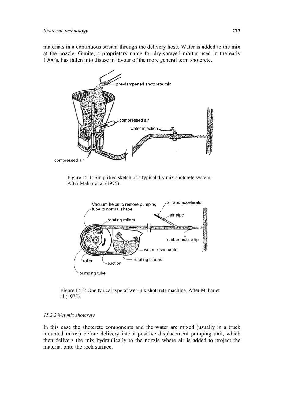 如图15.1所示,干喷射混凝土成分,可能稍作预减,以减少灰尘,被送入一个持续搅动的漏斗中。压缩空气是通过旋转桶或送料槽引入的,通过输送软管将物料输送到连续的水流中。水被加入到喷嘴的混合物中。在1900年代早期使用的干喷砂浆的专有名称“压力喷浆”已经被废弃了,取而代之的是更通用的喷射混凝土。