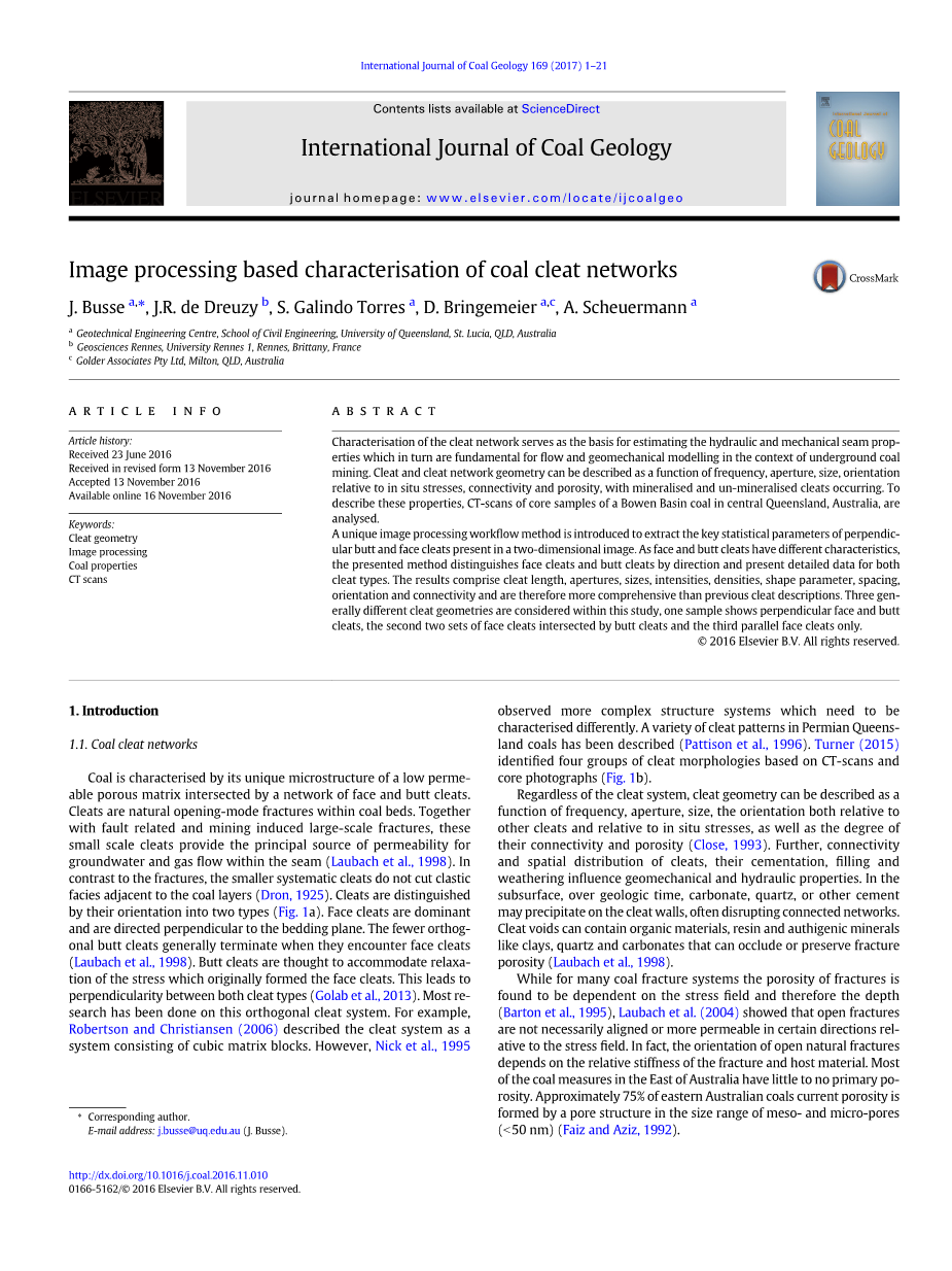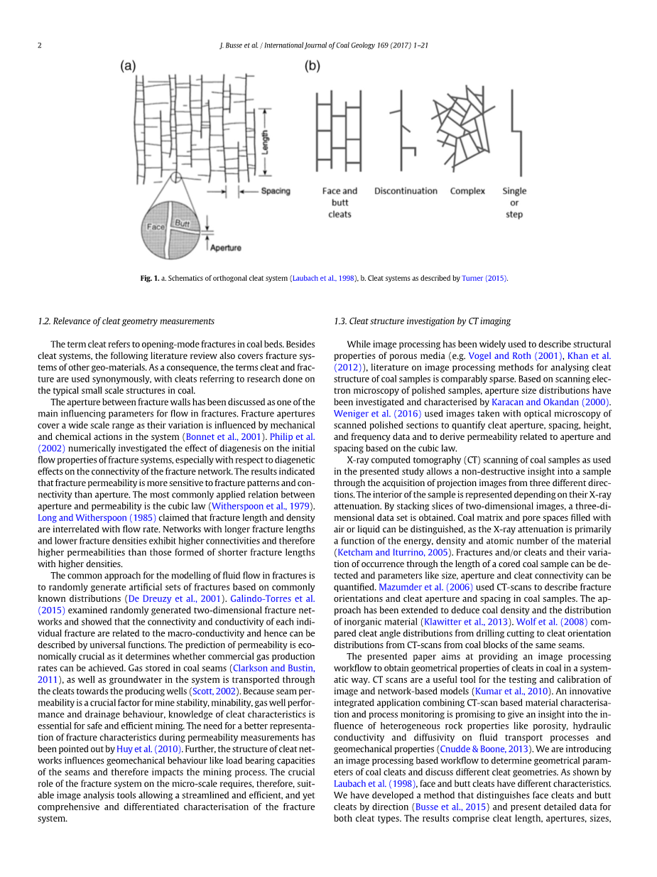 论文提出旨在提供一个图像处理工作流程,以系统的方式获得煤中管理的几何特性。 CT扫描是用于图像和网络模型的测试和校准的有效工具(Kumar等人,2010)。 基于CT扫描的材料表征和过程监测的创新综合应用将有助于研究非均质岩石性质(如孔隙度,导水率和扩散系数)对流体运移过程和地质力学特性的影响(Cnudde&Boone,2013)。我们正在引入一个基于图像处理的工作流程,以确定煤层的割理几何参数,并讨论不同的裂隙几何形状。 如Laubach等人所示(1998),面割理和端割理具有不同的特征。 我们已经开发了一种方法,通过方向区分面割理和端割理(Busse et al。,2015),并提供两种裂隙类型的详细数据。结果包括裂隙长度,孔径,尺寸,强度,密度,形状参数,间距,取向和连接性。 因此,所提出的方法提供了比以前的分割描述方法更全面的信息。