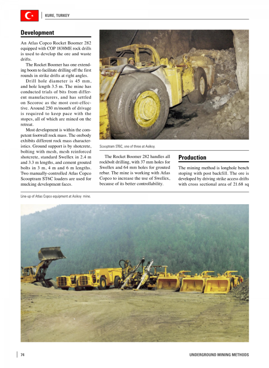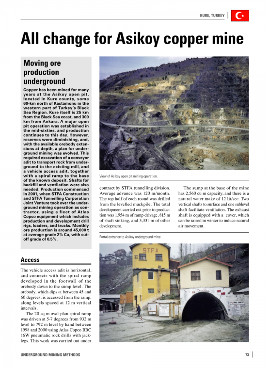 铜矿已在位于土耳其黑海地区西部卡斯塔莫努以北约60公里处的库尔县的Asikoy露天矿开采多年。Kure酒店距离黑海海岸有25公里,距离安卡拉有300公里。在六十年代中期建立了一个主要的露天矿场,生产一直持续到今天。然而,储量正在减少,并且随着可用的矿体扩展深度,地下采矿的计划也在不断掘进。这需要挖掘输送机,以便将岩石从地下输送到现有的轧机,以及车辆通道,以及螺旋坡道到已知矿的底部。竖井还需要回填和通风。生产始于2001年,当时STFA 建筑和STFA 隧道集团合资企业作为承包商接管了地下采矿作业,使用阿特拉斯·科普柯设备,包括生产和开发钻机,装载机和卡车。每月矿石产量约为45,000吨,平均品位为2%Cu,品位下限为0.5%。