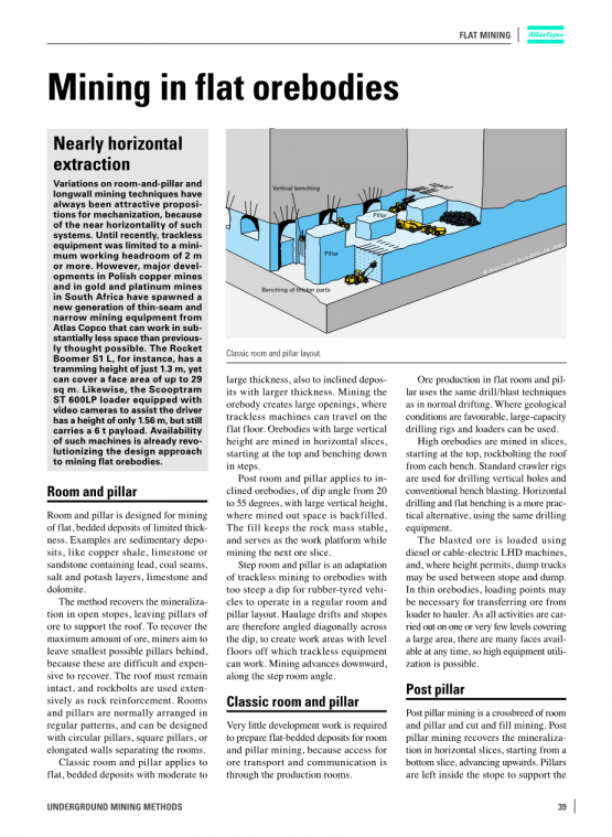 房柱采矿技术和长壁采矿技术的变化一直是机械化的困难问题,因为这些系统几乎是水平的。直到最近,无轨设备还被限制在2米或更高的工作空间。然而,波兰铜矿以及南非金矿和铂矿的重大开发,催生了阿特拉斯bull;科普科公司(Atlas Copco)新一代薄煤层和窄煤层采矿设备,它们的工作空间可能比以前想象的要小得多。火箭潮S1 L,例如,有一个乘电车的高度只有1.3米,但可以掩盖面积29平方米。同样,铲运机ST 600 lp装载机配备摄像机帮助司机的高度只有1.56米,但仍带有6 t负载。这类机器的可用性已经在改变水平矿体采矿的设计方法