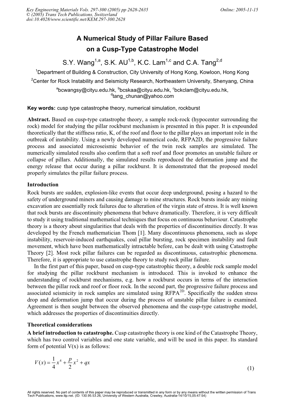 摘要 基于尖点突变理论,一个样品的岩石(震源周围的岩石)研究柱岩爆机理模型的提出。从理论上阐述了顶板和底板的刚度比、刚度比、顶底板和底板的刚度,对不稳定的爆发起着重要的作用。使用新开发的数字代码,RFPA2D,渐进破坏过程和相关的微震行为模拟岩石样本。数值模拟的结果也证实,软顶板和底板促进一个不稳定的失败或崩溃的支柱。此外,模拟结果再现了形变跳跃和能量释放在支柱岩爆过程中的发生。它表明,该模型正确模拟柱失效的过程。