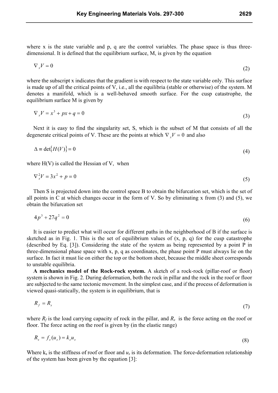 前言 岩爆是一种突发性、爆炸性的事件,发生在地下深处,构成了对井下矿工安全的危害,对矿山结构造成破坏。任何采矿开挖岩石破裂在本质上是由于蚀变岩石的失败的原始应力状态。众所周知,岩石破裂是不连续现象显著表现。因此,很难使用传统的数学技术研究,关注持续行为。突变理论是一种关于不连续的性质的奇异性理论。它是由法国数学家托姆提出。许多不连续的现象,如斜坡不稳定,水库诱发地震,煤柱爆破,岩石试样的不稳定和断层运动,之前一直在数学上棘手的,可以使用突变理论处理。绝大多数岩柱的破坏都可以看成是不连续的、突变的现象。因此,用突变理论研究岩柱破坏是恰当的。