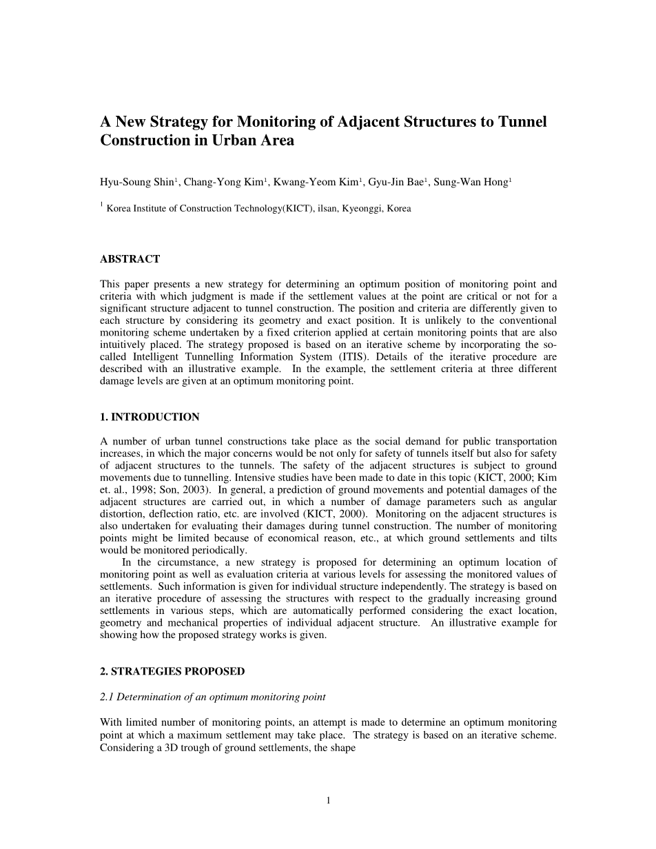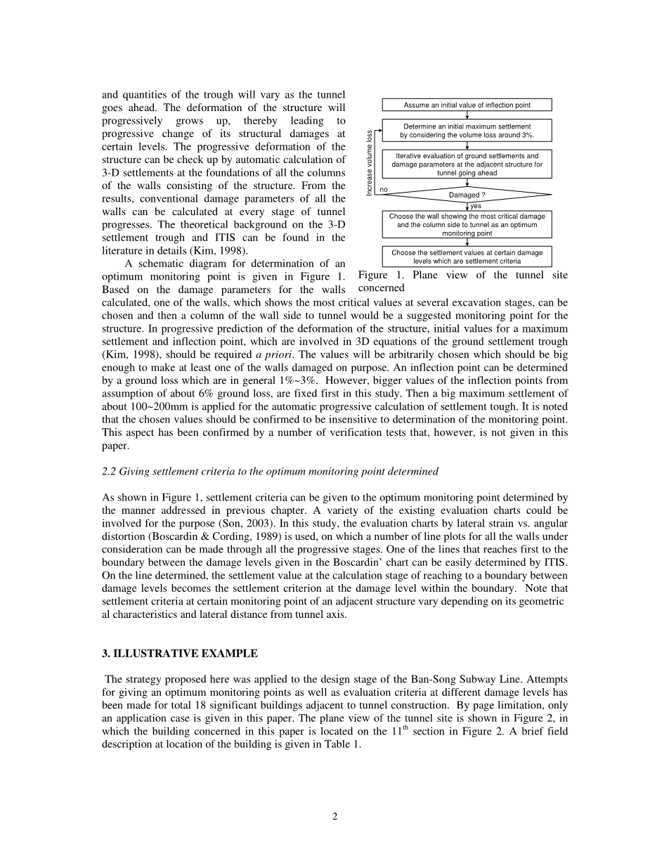本文提出了一种新的策略,以确定城市隧道施工邻近位最佳位置的监测点和判断标准,标准是通过判断邻近隧道结构的重要结构点的沉降值是否关键来确定。通过考虑其几何形状和精确位置,对每个结构的位置和标准不同。 在某些监测点应用固定标准的常规监测方案也不可能直观地放置。 所提出的策略是通过结合所谓的智能隧道信息系统(ITIS)的迭代方案。 使用说明性示例描述迭代过程的细节。 在这个例子中,在最佳监测点给出了三种不同损伤水平下的沉降标准。