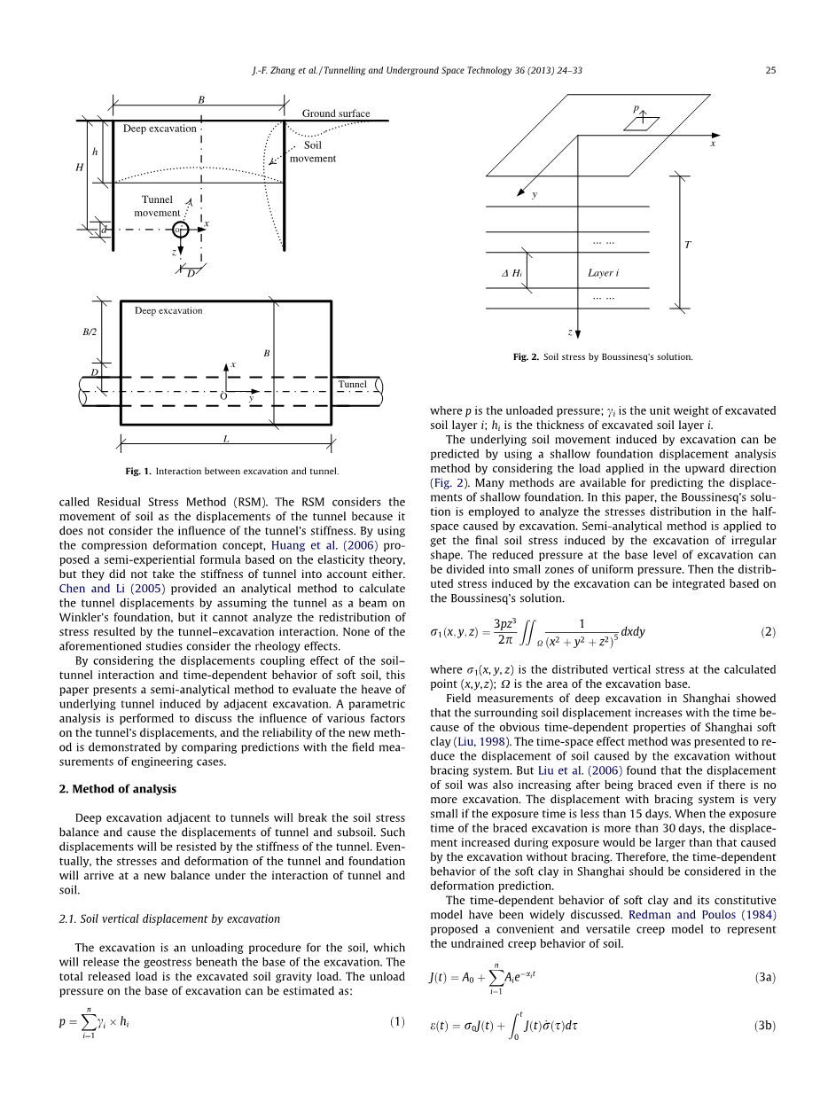 为了评估基坑开挖对现有隧道的影响和优化施工程序,一些半经验或分析方法已被用于快速预测。Ji和Liu(2001)推导出了一种简化计算邻近基坑开挖引起隧道的位移的方法,称为残余应力法(RSM)。RSM把土体的位移当作隧道的位移,因为它没有考虑影响隧道的刚度。通过使用压缩变形的概念,Huang et al. (2006)提出了一种基于弹性理论的半经验公式,但是该公式没有考虑隧道的刚度。陈和李(2005)通过假设隧道作为Winklerrsquo;s地基上的一个梁,给出了计算隧道位移的分析方法,但不能分析隧道-地基开挖相互作用引起的应力重分布。上述的所有研究都没有考虑流变学的影响。