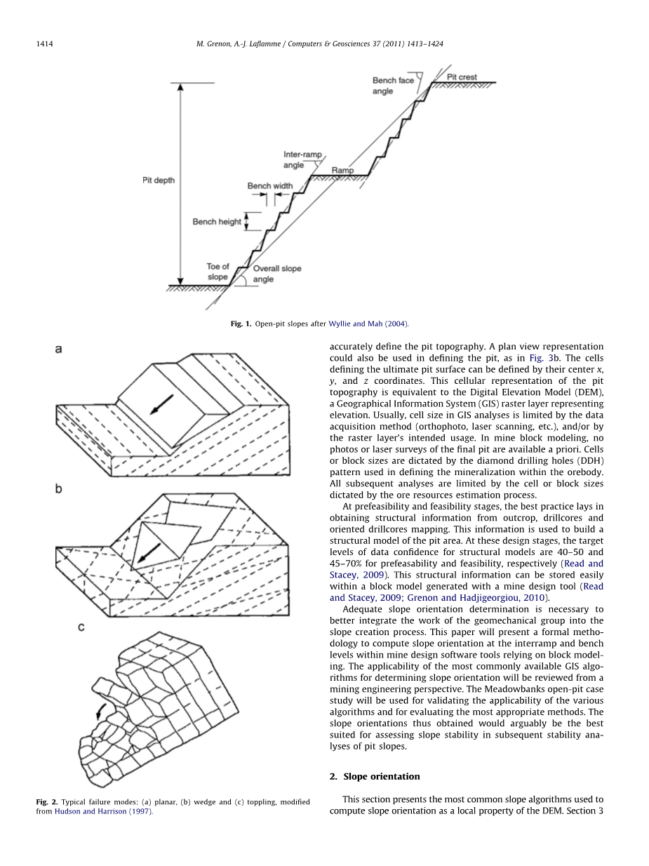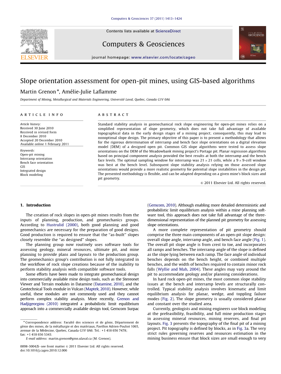 将地质力学设计集成到商业上可用的矿设计工具中已经做出一些努力,例如Datamine中的立体图查看器和地形模块,以及Vulcan中的Geotechnical Tools模块(Maptek,2010)。然而,虽然有用,但这些模块不常用,并且它们不能执行复杂的稳定性分析。最近,Grenon和Hadjigeorgiou(2010)将概率极限平衡方法集成到商业可用的设计工具Gemcom Surpac(Gemcom,2010)。虽然启用更详细的确定论与概率论极限平衡分析在矿山规划软件工具,这种方法没有充分利用的三 斜坡方向计划坑的几何维E表示。(Gemcom,2010)。虽然在矿山规划软件工具中实现更详细的确定性和概率极限平衡分析,但是该方法没有充分利用用于评估斜坡取向的计划凹坑几何的三维表示。