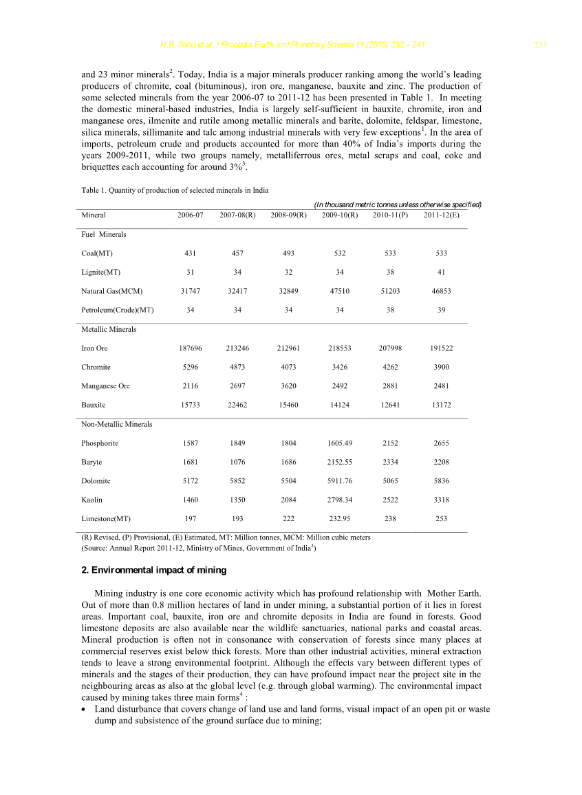 虽然矿业部门对印度国内生产总值的贡献约为2.2%至2.5%,但其重要性来自于它为该国的工业和经济发展提供基本和战略性原材料。由于价格的急剧上涨和一些矿产品的需求,自2004-051以来,许多矿物的产量在数量和价值方面都有稳步增长。由于消费水平的提高,基础设施的发展和经济的增长,预计矿产需求将快速增长。在印度,80%的采矿业是煤炭,其余20%是各种金属和原材料,如金,铜,铁,铬,铅,铝土矿,锌和铀。拥有多样化和重要矿产资源的印度是一些矿产的主要生产国。一方面,采矿技术的发展不断提供新的机会,但另一方面,其所有社会经济方面在全球化的影响下正在面临越来越复杂的挑战。因此,满足不断增长的原材料需求和减轻不利影响的战略是矿物开发战略的一部分。