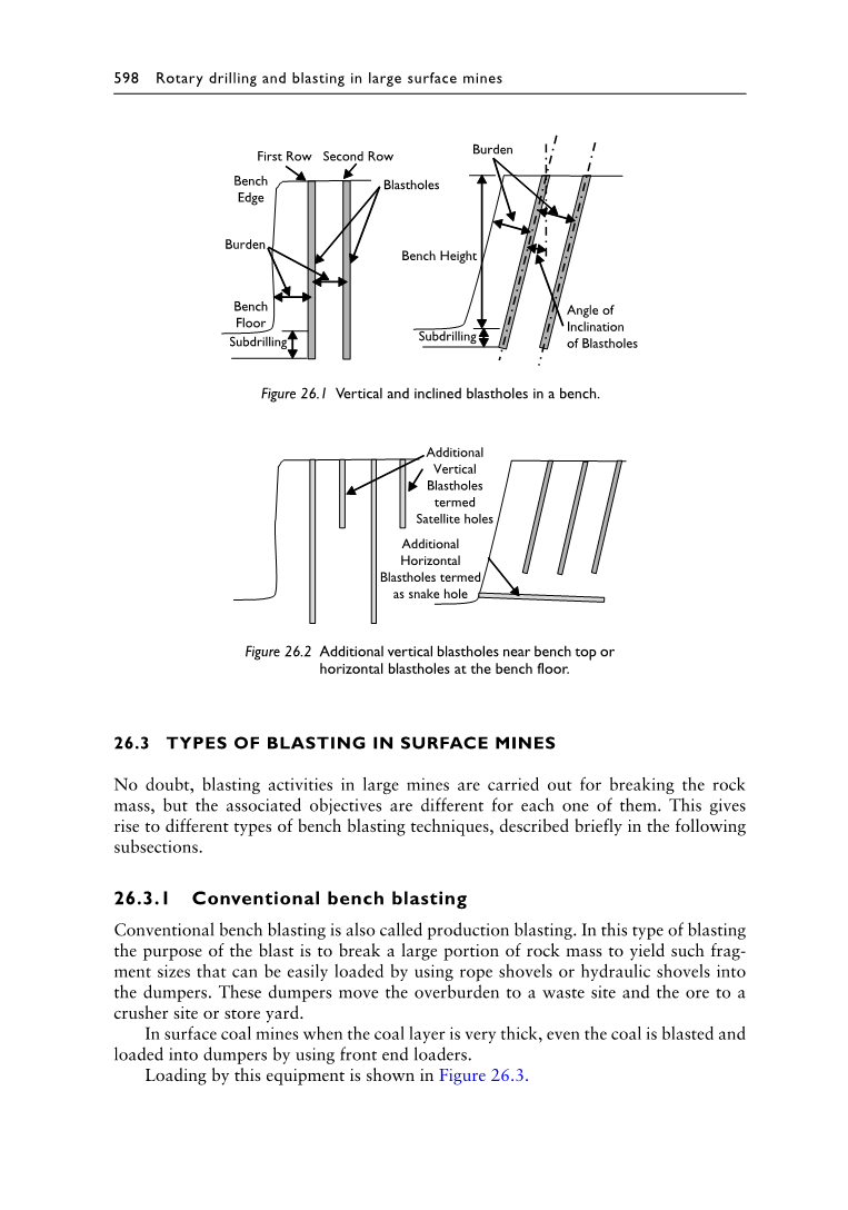 在某些情况下,除了主炮孔之外,还需要一些额外的垂直或倾斜的炮孔,如图26.2中左图所示,以便适当破碎岩体。根据岩体的特征,这些炮孔具有一半或甚至四分之一深度。这种炮孔被称为密集孔。类似地,当需要额外的水平炮孔(如图26.2右图所示)时,也会出现这种情况,它们被称为蛇穴。