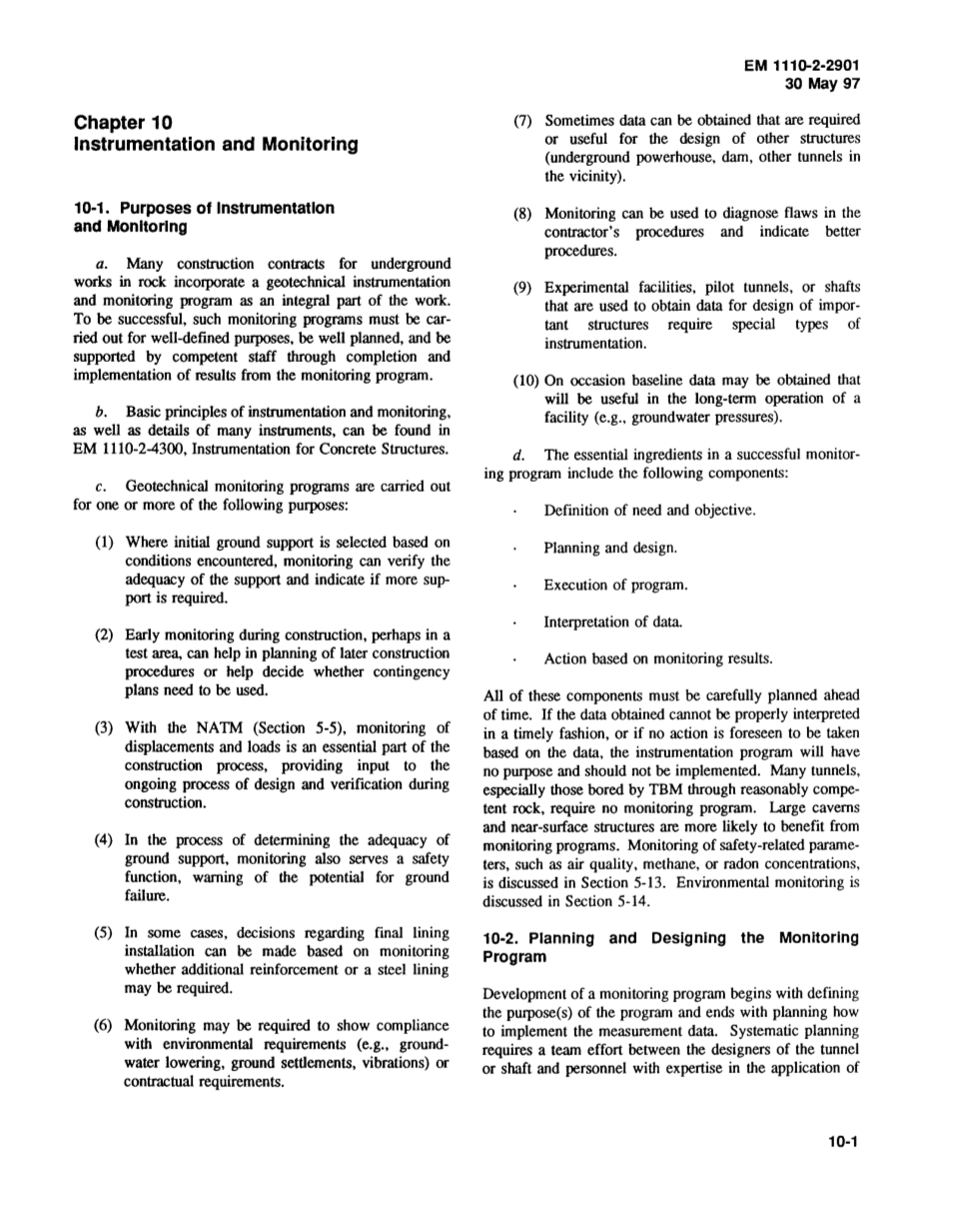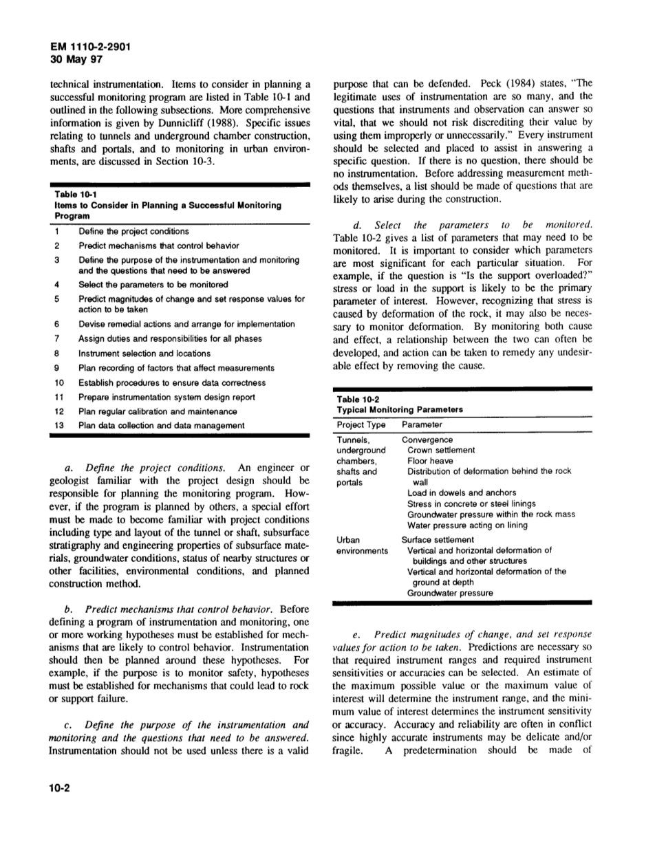 监控程序的开发从定义程序的目的开始,到规划如何实现测量数据结束。系统规划需要隧道或竖井设计人员和在技术仪器应用方面具有专业知识的人员之间的团队合作。表10-1列出了规划成功监测项目时应考虑的事项,并在以下小节中进行了概述。邓尼克利夫(1988)提供了更全面的信息。有关隧道和地下室施工、竖井和入口以及城市环境监测的具体问题,见第10-3节。