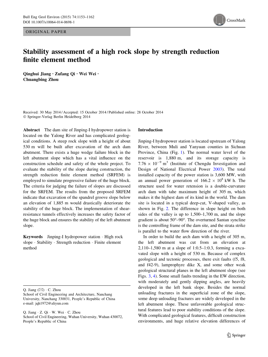 摘要:锦屏一级水电站坝址位于Yalong江,地质条件复杂。 在拱坝坝肩开挖后,将建造一个高度约530米的陡峭岩石边坡。左坝肩边坡存在巨大的楔形破坏块,对整个工程的施工进度和安全性有重要影响。 为了评估施工期间斜坡的稳定性,采用强度折减有限元法(SRFEM)来模拟大块的渐进破坏。其讨论了判断斜坡失效的标准。所提出的结果表明,在1885米高度以下的拱肩沟坡的开挖将大大降低巨型块的稳定性。剪切阻力隧道的实施有效地提高了大块体的安全系数,保证了左坝肩边坡的稳定性。