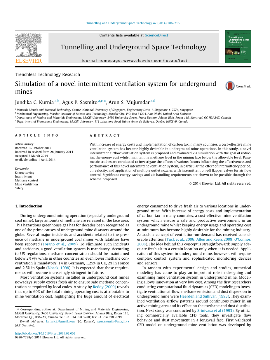 随着许多国家能源成本的增加和碳税的实施,经济高效的矿井通风系统已经成为地下矿山运营中非常理想的选择。 在这项研究中,提出了一种新型的间歇式气压通风系统,并通过模拟进行评估,目的是降低能源成本,同时将采矿工作面的甲烷水平保持在允许水平以下。 进行参数研究以调查各种因素对这种新型间歇通风系统的有效性和性能的影响,特别是间歇期,空气流速和多个出口喷嘴以及用于空气流动的间歇式开关阀门的应用控制。 通过所提出的方案,显示出有意义的节能和空气处理要求是可能的。
