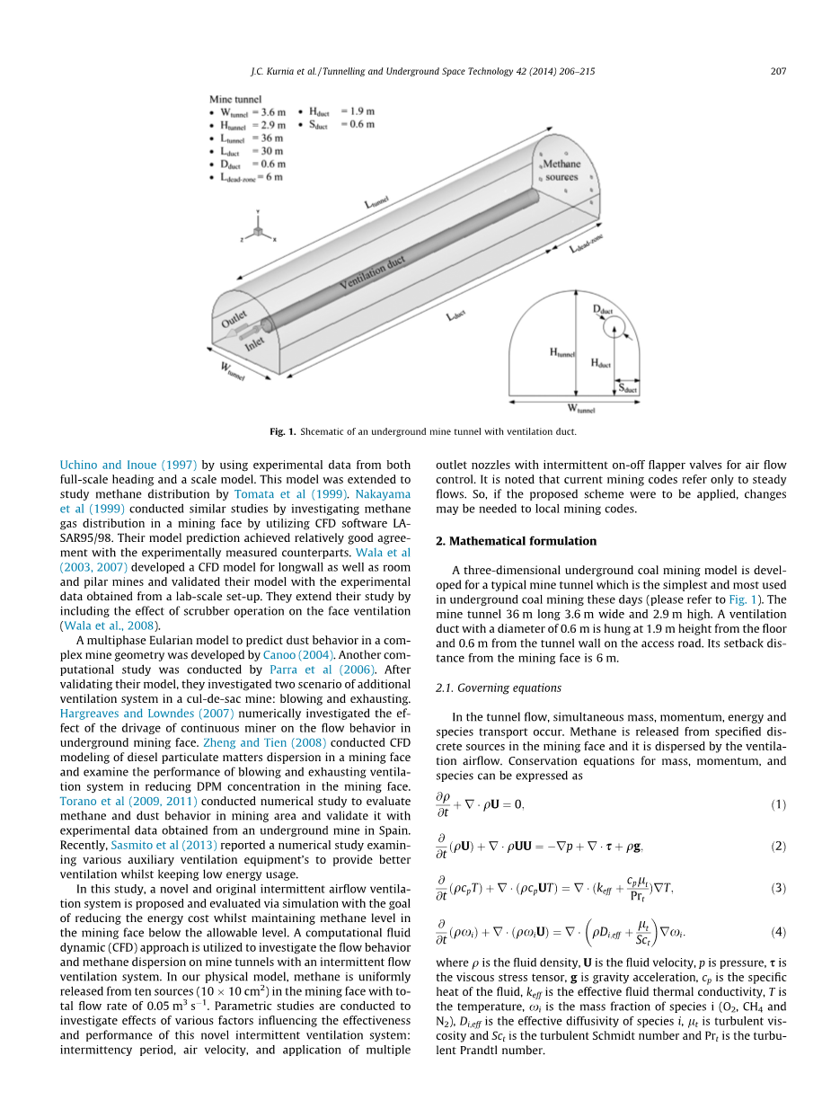 在隧道流量中,同时出现质量,动量,能量和物种运输。 甲烷从采矿工作面的特定离散源中释放出来,并由通风气流分散。 质量,动量和物种的守恒方程可以表示为
