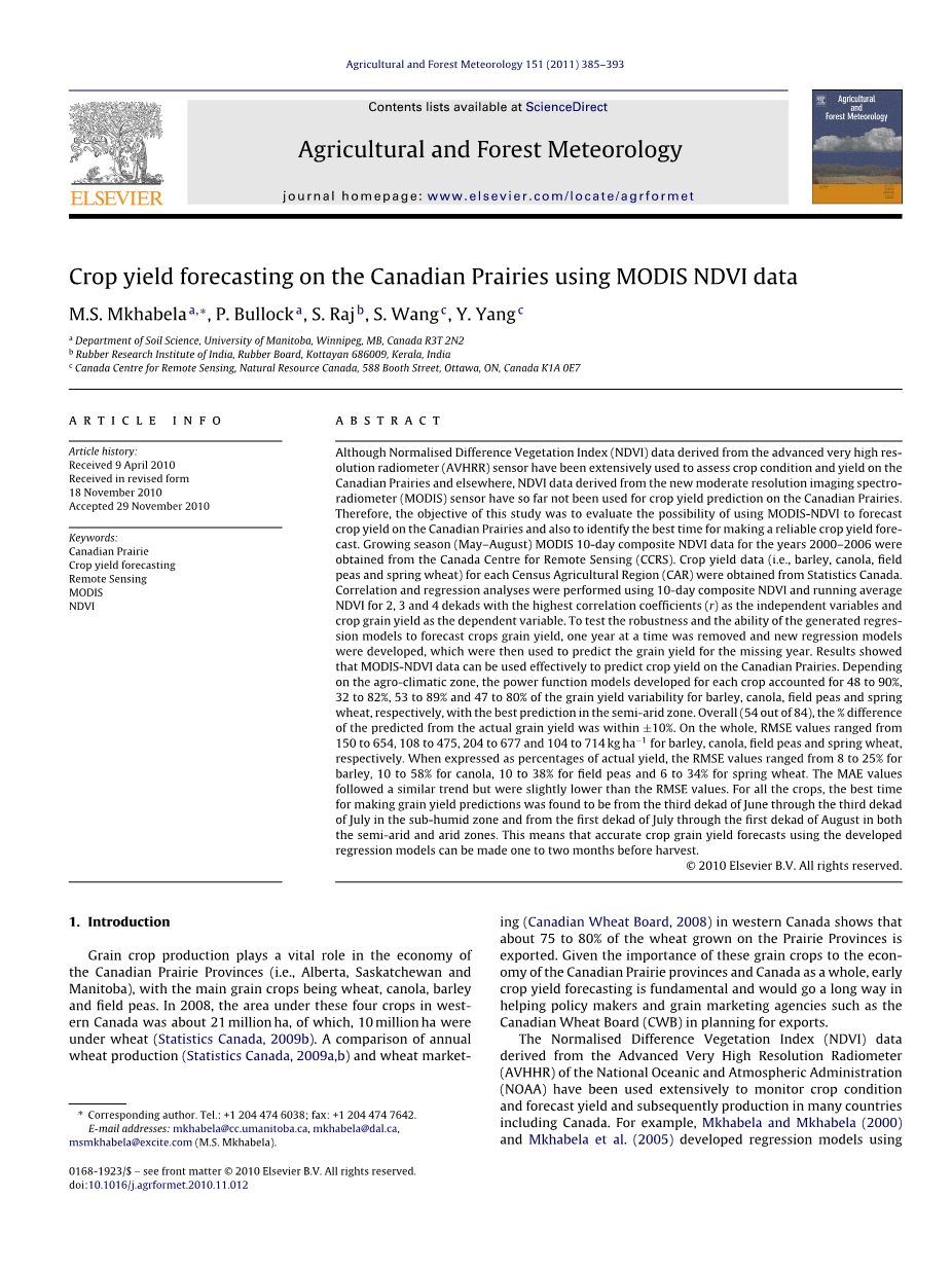 国家海洋和大气管理局(NOAA)的高级甚高分辨率辐射计(AVHHR)得到的归一化植被指数(NDVI)数据已被广泛用于监测作物状况,预测产量以及随后在包括加拿大在内的许多国家的产量。例如,Mkhabela和Mkhabela(2000)以及Mkhabela等人(2005)利用AVHHR-NDVI数据分别在斯威士兰开发了预测棉花和玉米产量的回归模型,并得出结论认为两种作物的产量在收获前至少可以准确预测2个月。Unganai和Kogan(1998)报道,AVHHR-NDVI来源的植被调节指数(VCI)在关键阶段与津巴布韦的玉米产量显著相关(r = 0.32-0.95)。同样,Lewis 等人(1998)发现AVHHR-NDVI与肯尼亚的玉米产量显著相关(r = 0.75,p lt;0.05),并报告玉米产量预测可在收获前一个月进行。在西班牙,Vicente-Serrano等人(2006)合并AVHHR-NDVI数据和干旱指数,并能够在收获前四个月预测小麦和大麦产量。他们的预测模型分别解释了小麦和大麦产量变异的88%和82%。