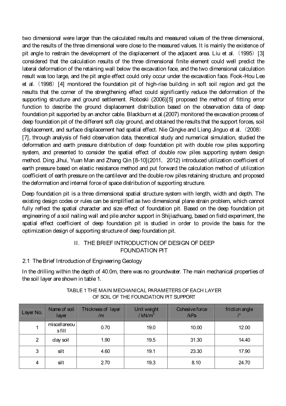 深基坑是一个具有长度,宽度和深度的三维空间结构体系,现有的设计规范或规则可以简化为二维平面应变问题,不能充分反映基坑的空间特征和尺寸效应。基于石家庄土钉墙和桩锚支护的深基坑工程,在现场试验的基础上,研究了深基坑的空间效应系数,为深基坑支护结构优化设计提供了依据。