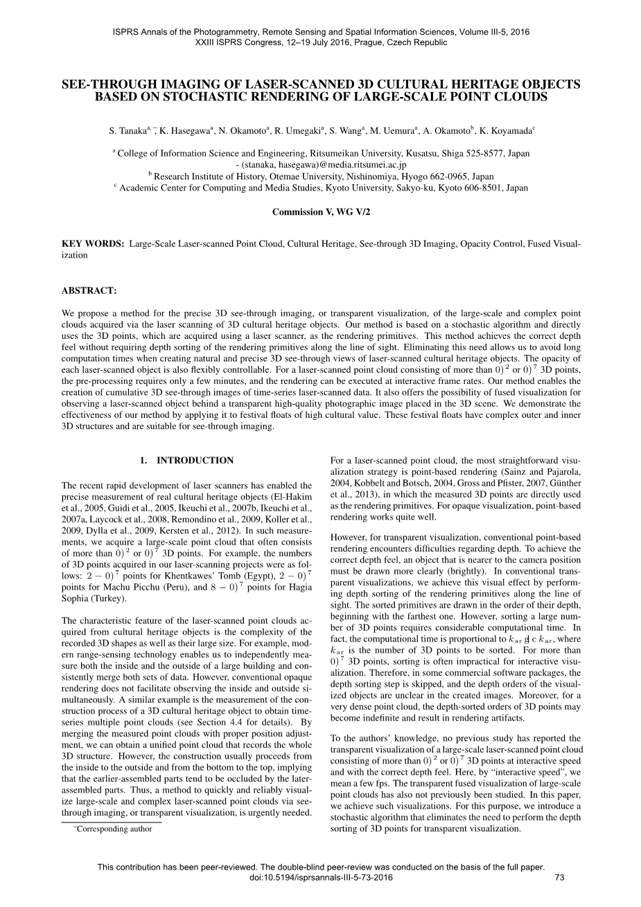 我们提出了一种精确的三维透视成像或透明可视化方法,用于大规模复杂点通过3D文化遗产物体的激光扫描获得云。我们的方法基于随机算法并直接将使用激光扫描仪获取的3D点作为渲染基元。该方法在不需要沿着视线对渲染图元进行深度排序的情况下获得正确的深度感。消除这种需求使我们能够在创建激光扫描文化遗产物体的自然和精确的3D透视视图时避免长时间的计算。每个激光扫描物体的不透明度也是灵活可控的。对于包含超过107个或108个3D点的激光扫描点云,预处理仅需要几分钟,渲染可以以交互式帧速率执行。我们的方法可以创建时间序列激光扫描数据的累积三维透视图像。它还提供了融合可视化的可能性,用于观察放置在3D场景中的透明高质量摄影图像后面的激光扫描对象。我们通过将它应用于具有高文化价值的节日花车来展示我们方法的有效性。 这些节日漂浮物具有复杂的外部和内部三维结构,适用于透视成像。