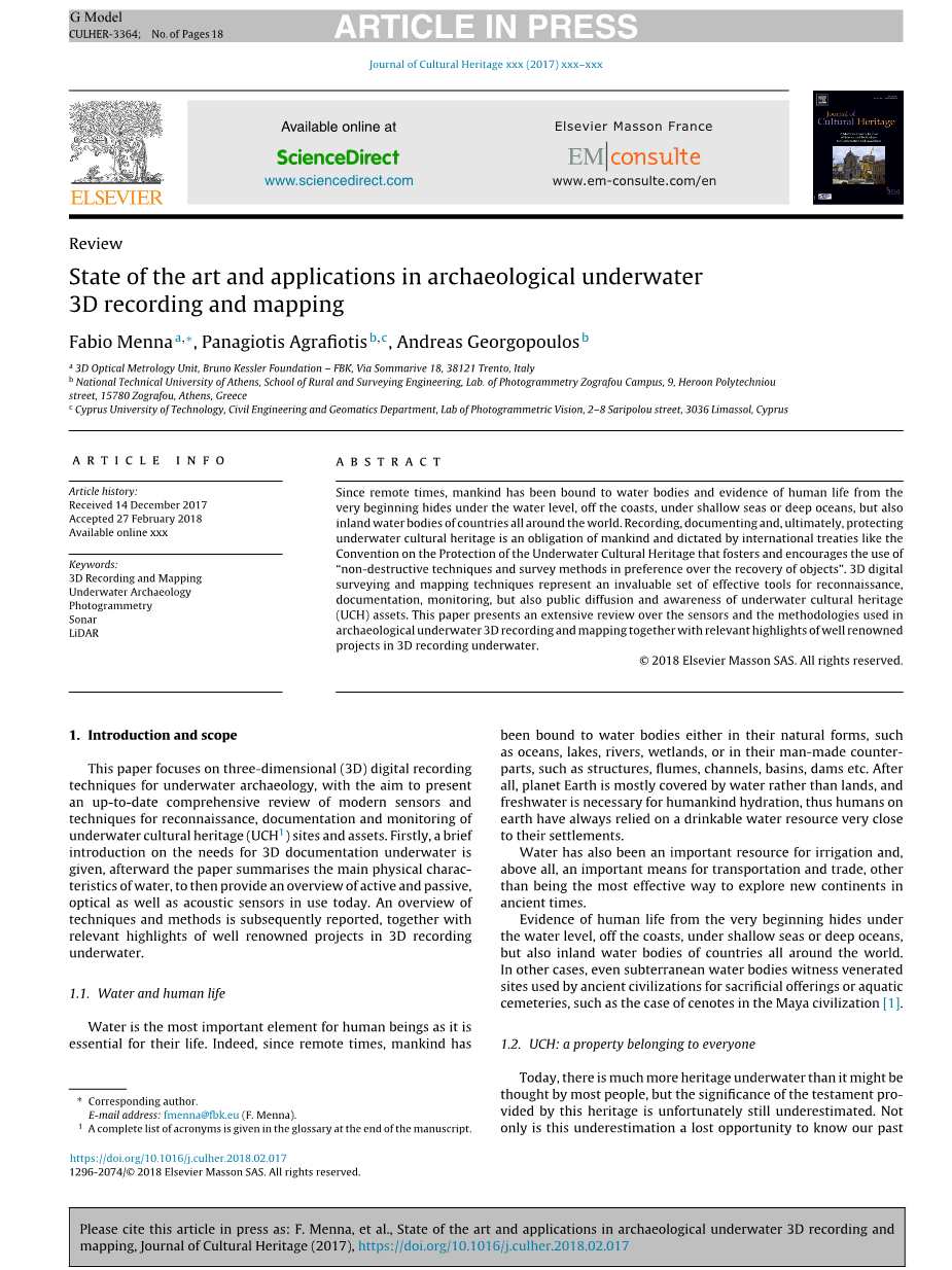 从遥远的时代开始,人类就已经被束缚在水体上,人类生命的证据从一开始就隐藏在水面以下、沿海、浅海或深海,而且遍布世界各国的内陆水体。记录、记录和最终保护水下文化遗产是人类的义务,并通过诸如保护水下文化遗产公约等国际条约的规定,鼓励使用“非破坏性技术和冲浪”。y方法优先于对象的恢复。3D数字测绘技术是一种非常有效的工具,用于侦察、记录、监测,而且是水下文化遗产(UCH)资产的公众传播和意识。本文介绍了在考古水下3D记录和绘图中使用的传感器和方法的广泛回顾以及著名的3D水下记录项目的相关亮点。