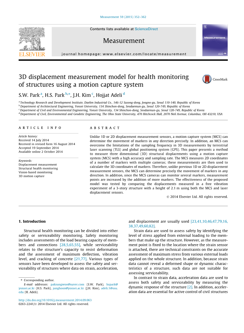 本研究提出了一种使用运动捕捉系统(MCS)以高精度和采样率测量三维结构位移的方法。 MCS使用多台摄像机测量多个标记的二维坐标; 然后使用这些测量结果来计算标记的3D坐标。 因此,与以前的1D或2D位移测量传感器不同,MCS可以精确确定标记在任何方向上的移动。 另外,由于MCS相机可以监视多个标记,所以S.W.增加了测量点。 Park等人 /测量59(2015)352-362 353添加更多标记。 通过比较使用MCS和激光位移传感器的3层结构的自由振动实验中测得的位移与2.1米高度的比较来验证所提出的模型的有效性。