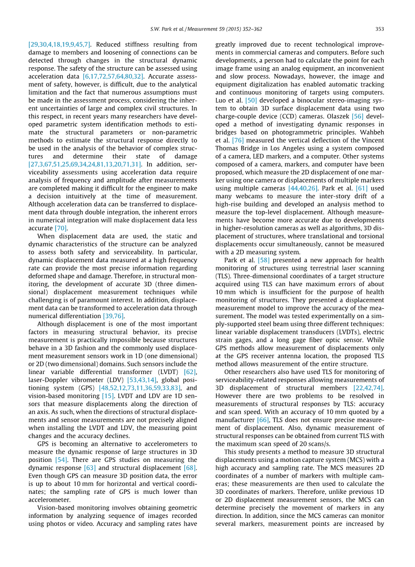 基于视觉的监测涉及通过分析使用照片或视频录制的图像序列来获取几何信息。由于商用相机和计算机的最新技术改进,精度和采样率已经大大提高。在这样的发展之前,一个人不得不使用模拟设备来计算每个图像帧的点,这是一个不方便和缓慢的过程。然而,现在,图像和设备数字化已经实现了使用计算机对目标进行自动跟踪和持续监控。罗等人。 [50]开发了双目立体成像系统,以使用两个电荷耦合器件(CCD)相机获得三维表面位移数据。 Olaszek [56]开发了一种基于摄影测量原理研究桥梁动力响应的方法。 Wahbeh等人[76]使用由相机,LED标记和计算机组成的系统测量了洛杉矶文森特托马斯大桥的垂直偏转。其他由相机,标记器和计算机组成的系统已经被提出,其使用一个相机测量一个标记的二维位移或使用多个相机测量多个标记的位移[44,40,26]。 Park等人[61]使用许多摄像头来测量高层建筑的层间漂移,并开发了一种分析方法来测量顶层位移。尽管由于高分辨率相机以及算法的发展,测量结果已经变得更加精确,但使用二维测量系统无法测量结构的三维位移,其中平移和扭转位移同时发生。